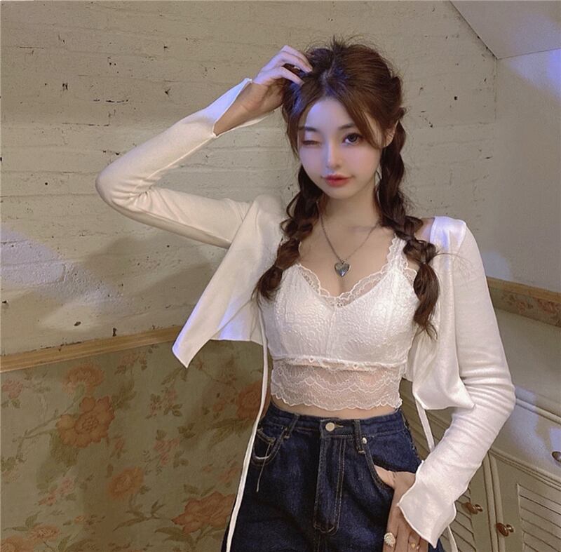 ショートレースアップ長袖ニットセータートップレディース2020秋新作スタイルスモールセーターオープンkスリムカーディガンジャケット ブラックストロベリース9125549304