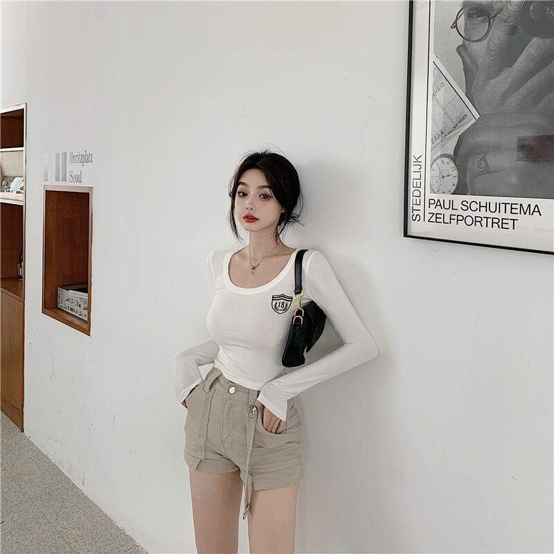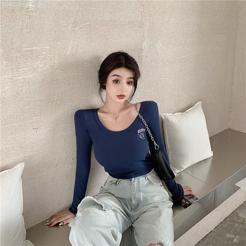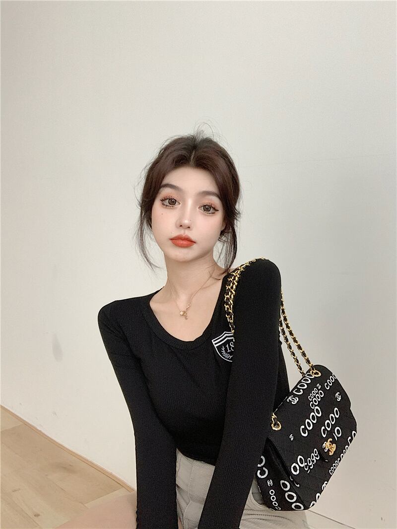 ショート刺繍長袖プルオーバーセータートップレディース2020秋ニューブルータイトフィットインナーベースシャツ ブラックストロベリース49534656662