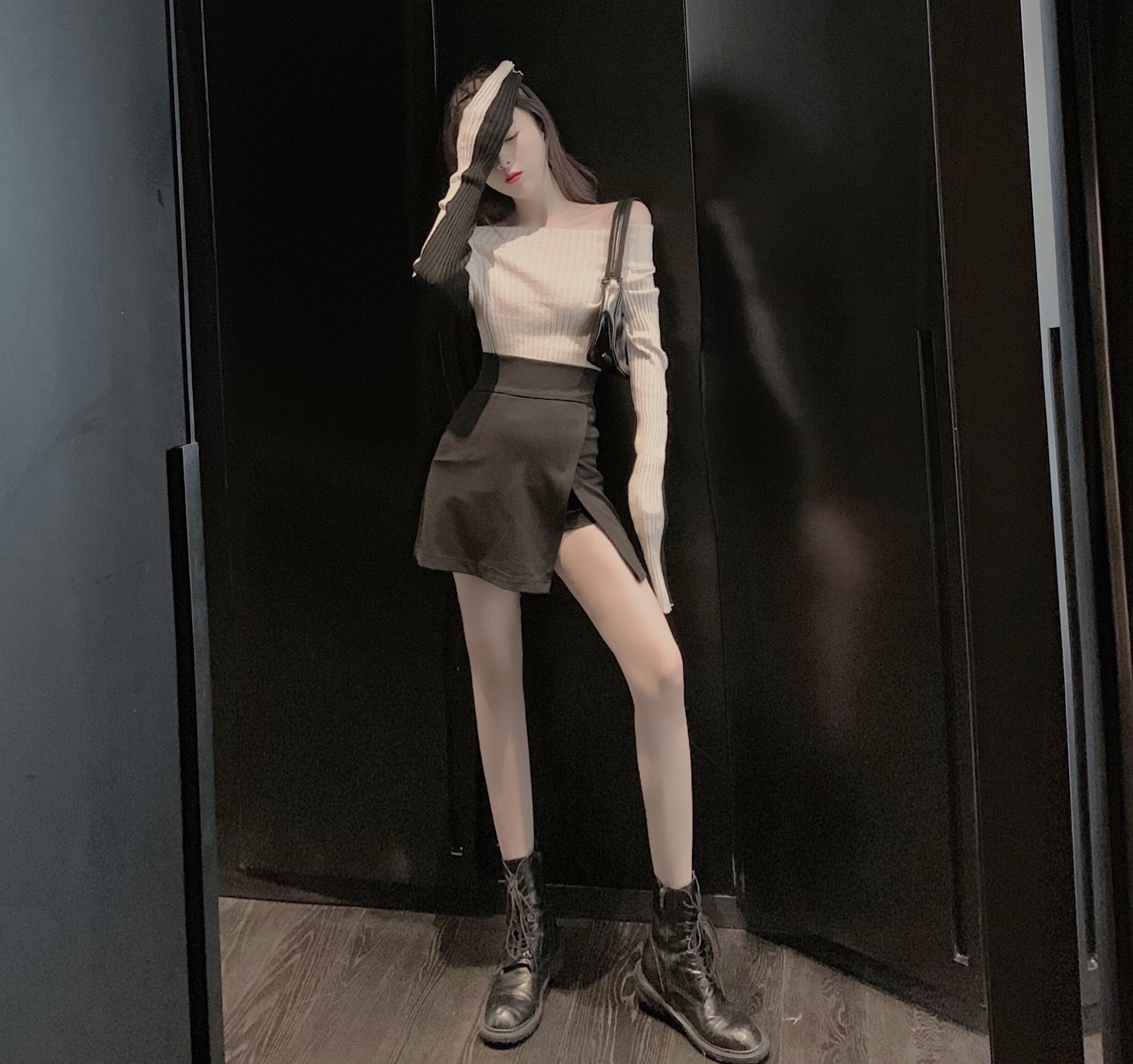 ワンショルダーカラーマッチング長袖セーターセータートップ女性2020年秋新しいストラップレスタイトフィットインナーベースシャツ ブラックストロベリース99347240824
