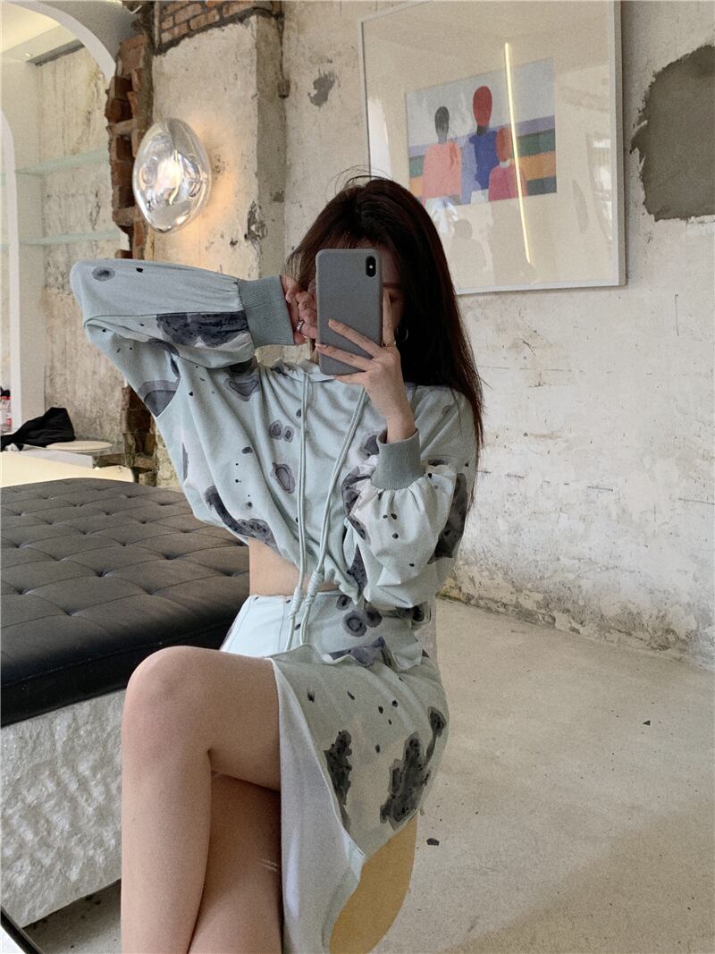 絞り染めのフード付きセーター女性秋ルーズスタイル怠惰なスタイル長袖プルオーバージャケット2020新しいクロップトップ ブラックストロベリース86438798941