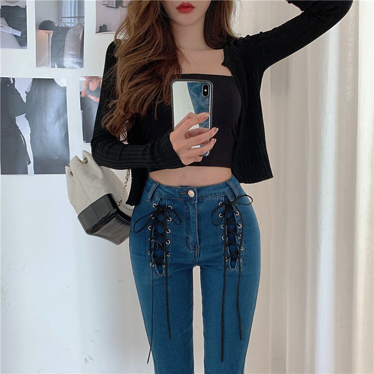 センスドローストリングハイウエストスリムストレッチジーンズレディース2020年秋新作パンツタイトフットパンツ ブラックストロベリース76270854514