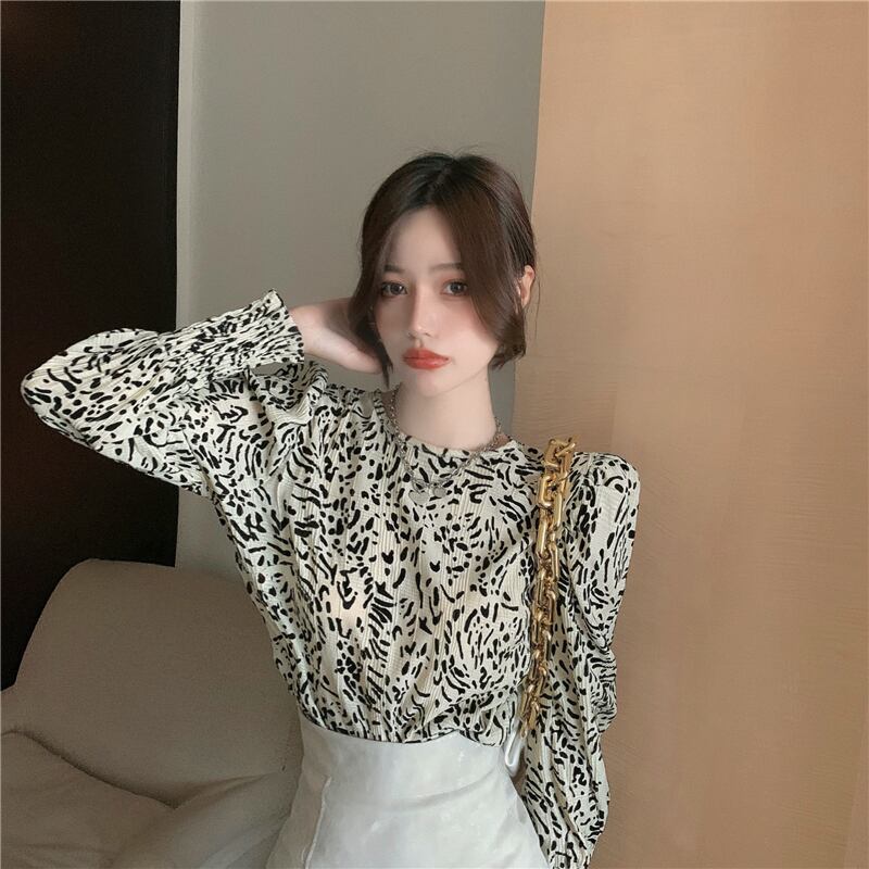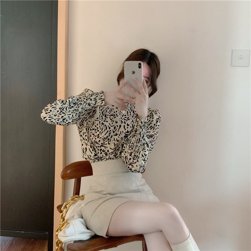 香港スタイルのデザインニッチヒョウ柄長袖シャツトップレディース2020年秋新作オールマッチパフスリーブシャツ ブラックストロベリース50848291843