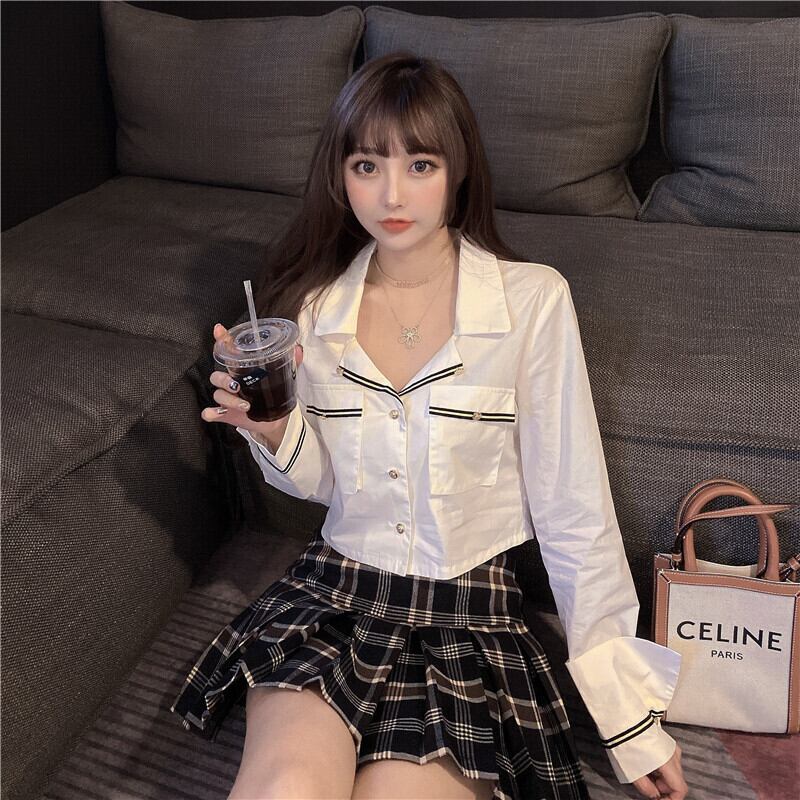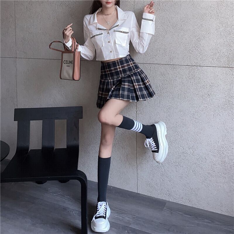 色:シャツトップ,チェック柄スカート