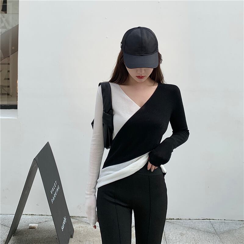 偽の2つの不規則なステッチニットVネックTシャツ女性の2020年秋新しいタイトフィット長袖ボトミングシャツトップ ブラックストロベリース89127910533