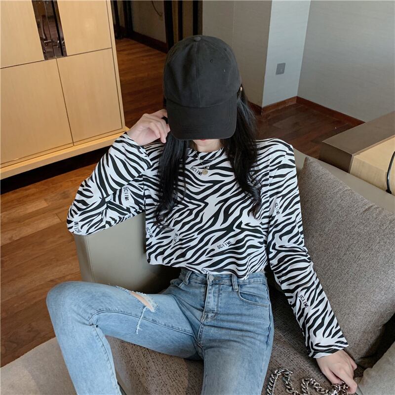 ゼブラ柄ショートTシャツレディースフォールルーズで薄手の長袖ボトミングシャツ2020ニューインナートップ ブラックストロベリース65423608273