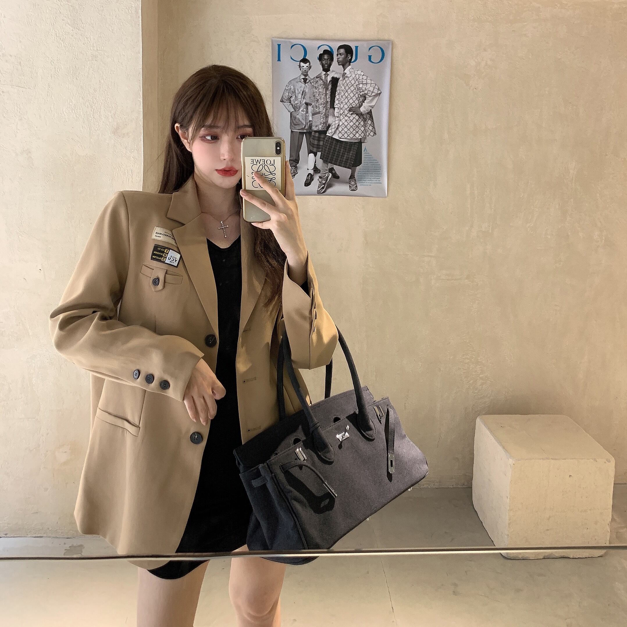 カーキショルダーパッドスモールスーツ女性秋バージョンルーズフライドストリートスーツ2020新しいミドル丈トップコート ブラックストロベリース40053062935