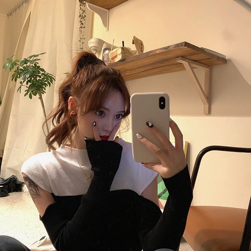 センス黒と白のステッチコントラストカラー長袖ニットセータートップ女性2020秋新しいタイトフィットインナーベースシャツ ブラックストロベリース21963119380