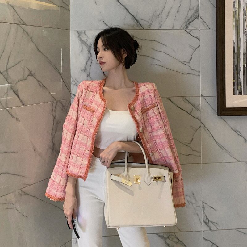 オールマッチセレブ気質ツイードチェック柄ショートジャケット女性2020年秋新バージョンピンクルーズトップ ブラックストロベリース96481198808