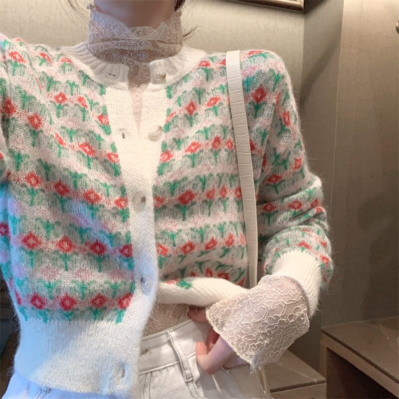 レトロプリントアプリコットニットスモールカーディガンレディース秋冬ルーズ長袖セータージャケット2020新作クロップドトップ ブラックストロベリース70038047944
