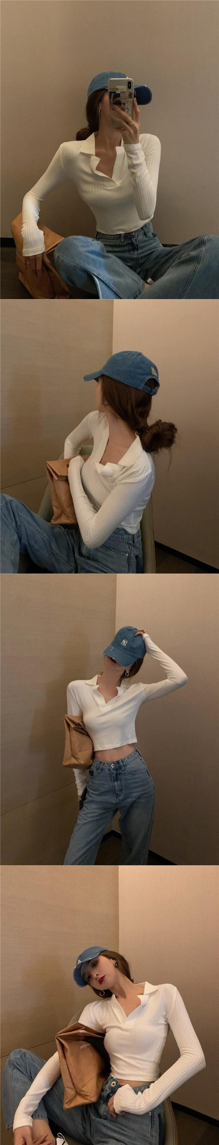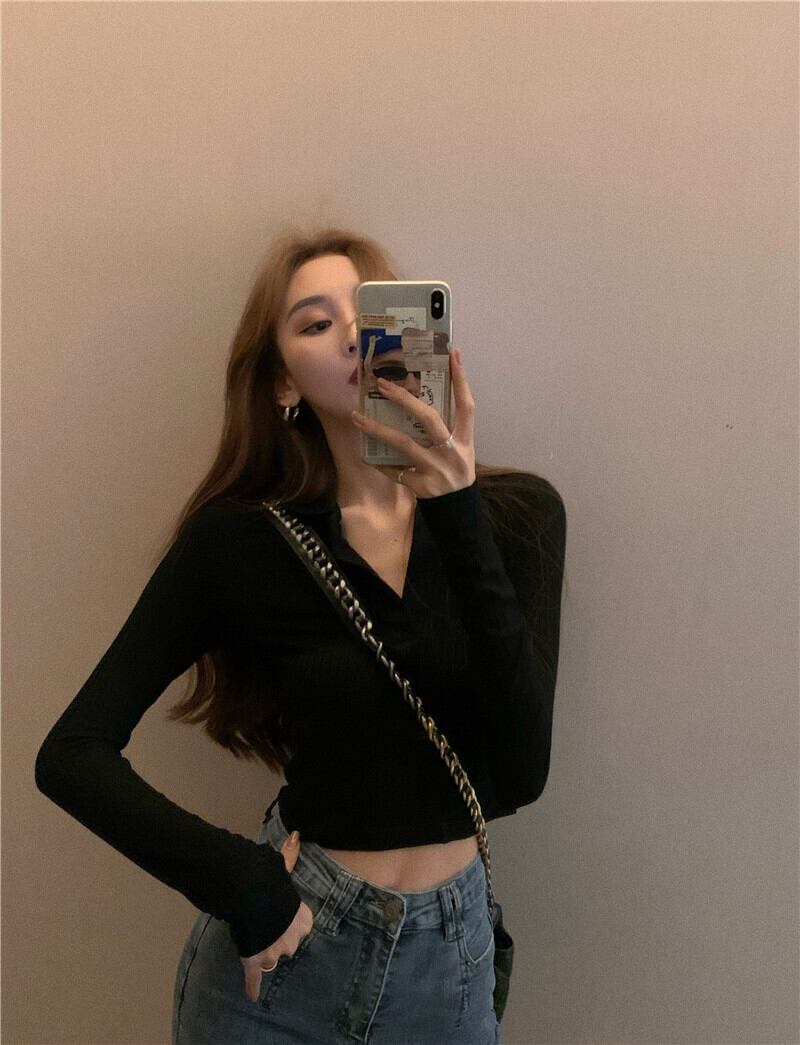 ポロカラーショートクロップド長袖セータートップレディース2020年秋新作ホワイトタイトフィットインナーベースシャツ ブラックストロベリース57434393001