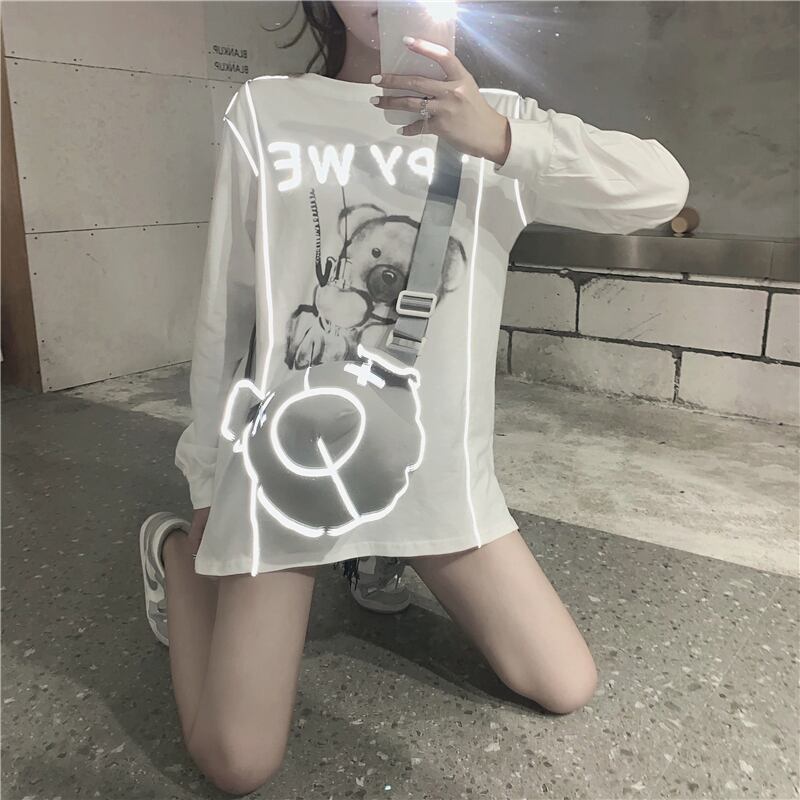 ルーズな反射クマ柄長袖Tシャツレディース2020年秋新作ワイルドグレーレイジーウィンドトップ ブラックストロベリース54561251376