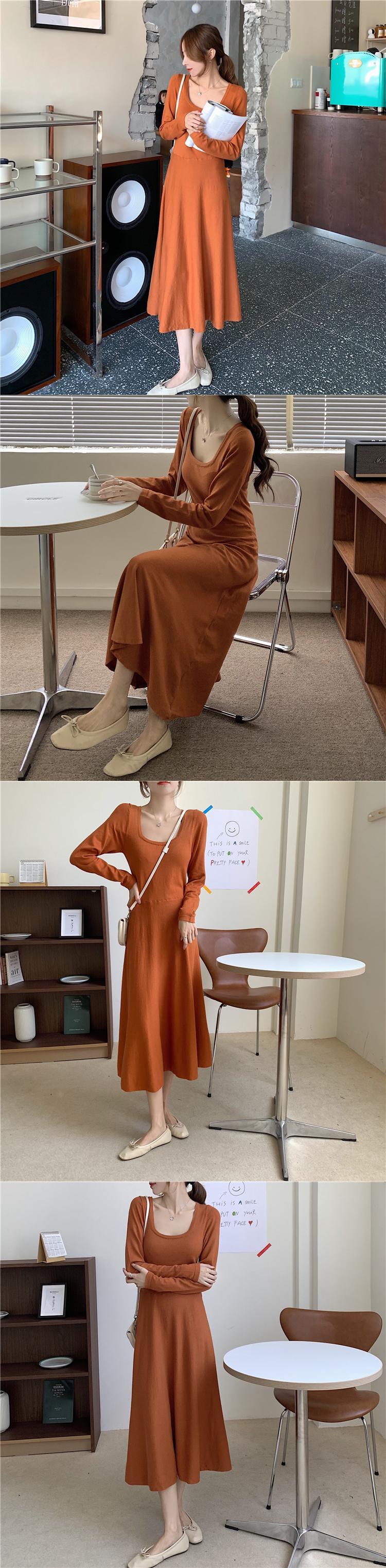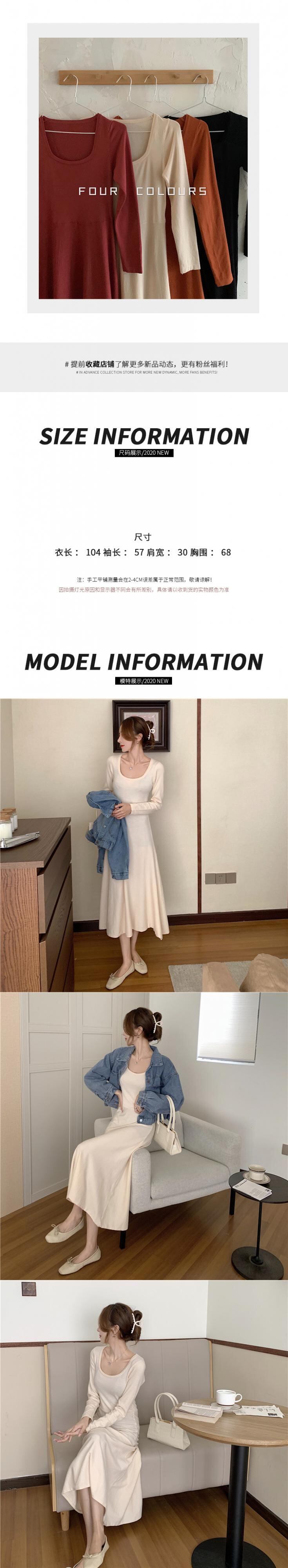 ニットボトミングスカート長袖ワンピース女性2020年秋冬新作ミドル丈スカートスクエアネック気質ウエストAラインスカート ブラックストロベリース10795668242