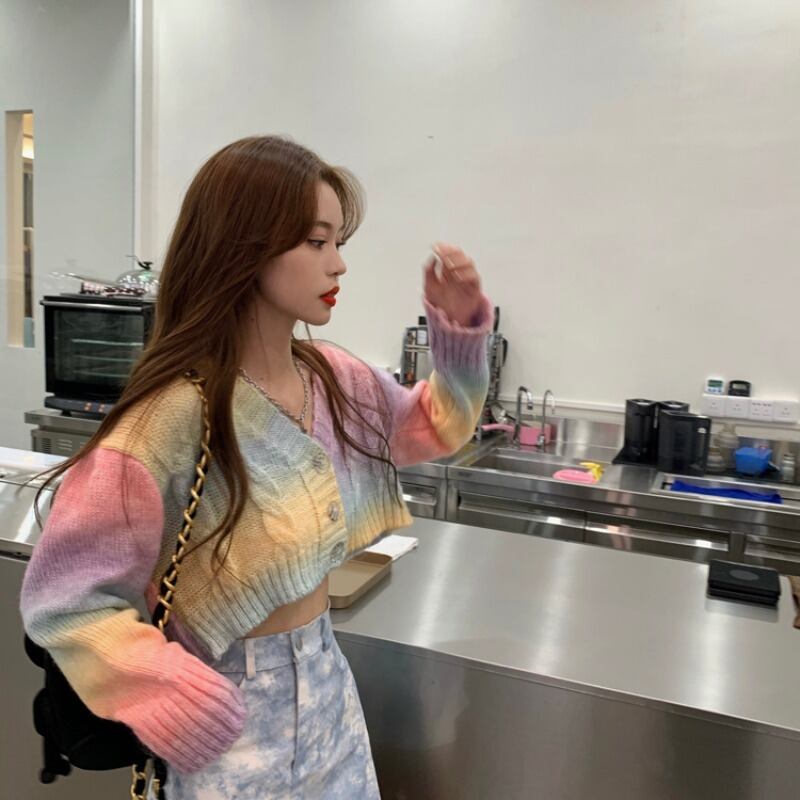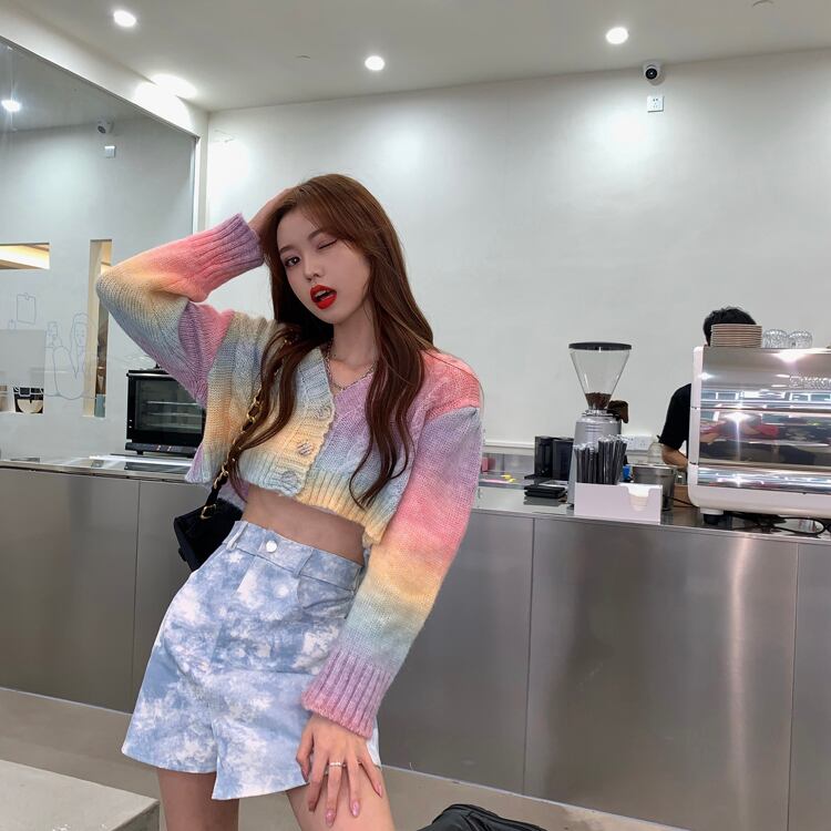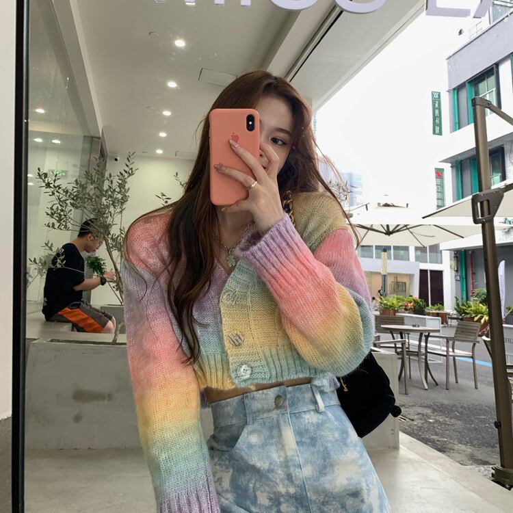 レインボー絞り染めショートルーズ長袖セーターカーディガンジャケットレディース2020年秋新作アウターニットセータートップ ブラックストロベリース7586806183