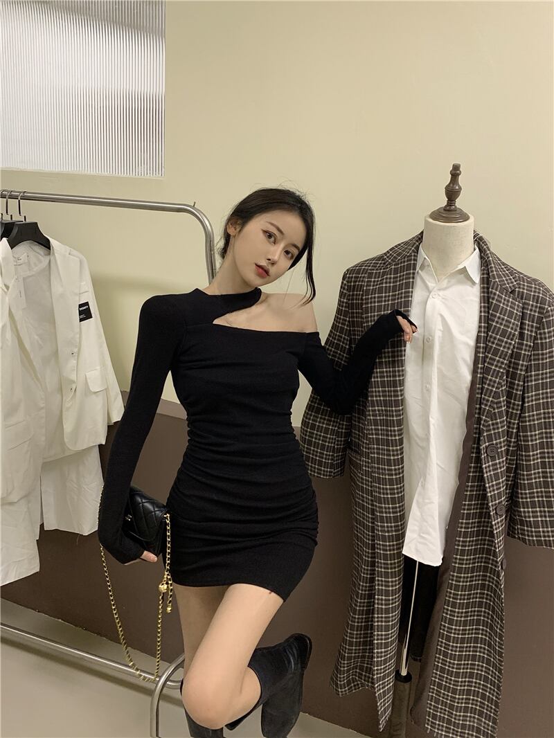 オフショルダーボトミングドレス女性2020年秋冬新作タイトフィットヒップ長袖スカート気質ウエストスリミングショートスカート ブラックストロベリース4219603090