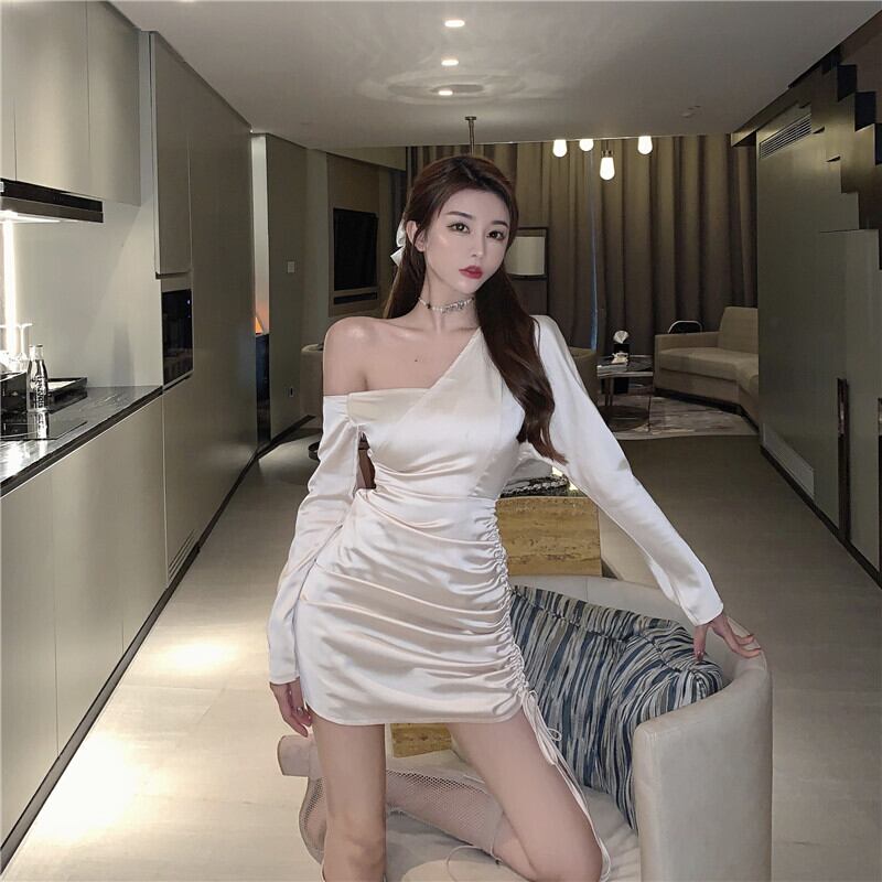 ドレスレディース斜めショルダースリムウエストバッグヒップスカート2020秋冬新作Vネック気質インナーベーススカート ブラックストロベリース82447214544
