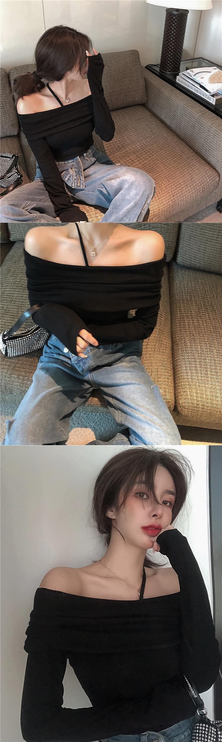 ワンショルダータイトフィットブラックホルターショート長袖Tシャツレディース2020年秋新作インナーベースシャツトップス ブラックストロベリース26710272488