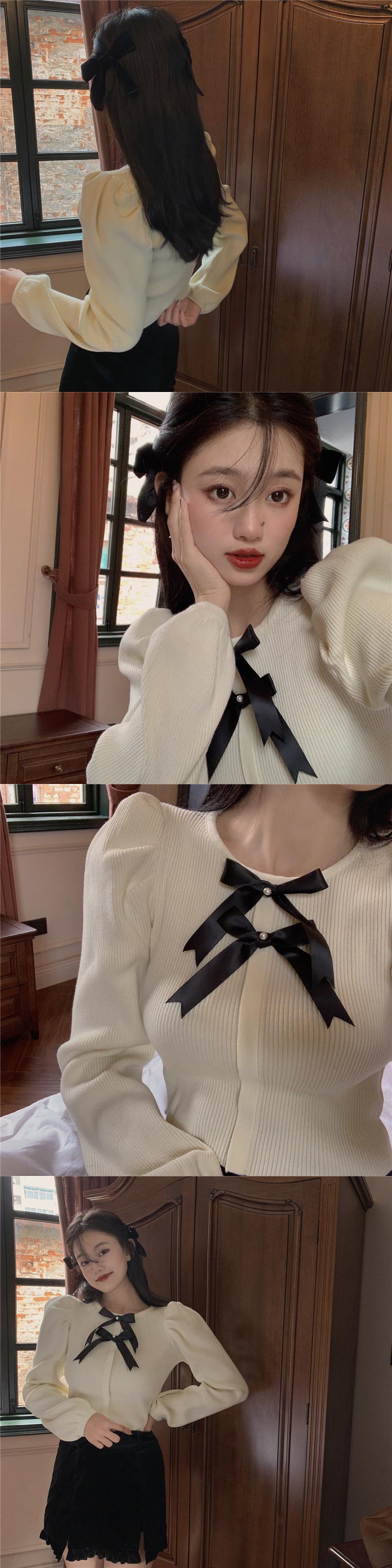 ニット ショートシャツ オータムウィンタースタイルセーター リボン 秋物 冬物 ブラックストロベリース55109335932