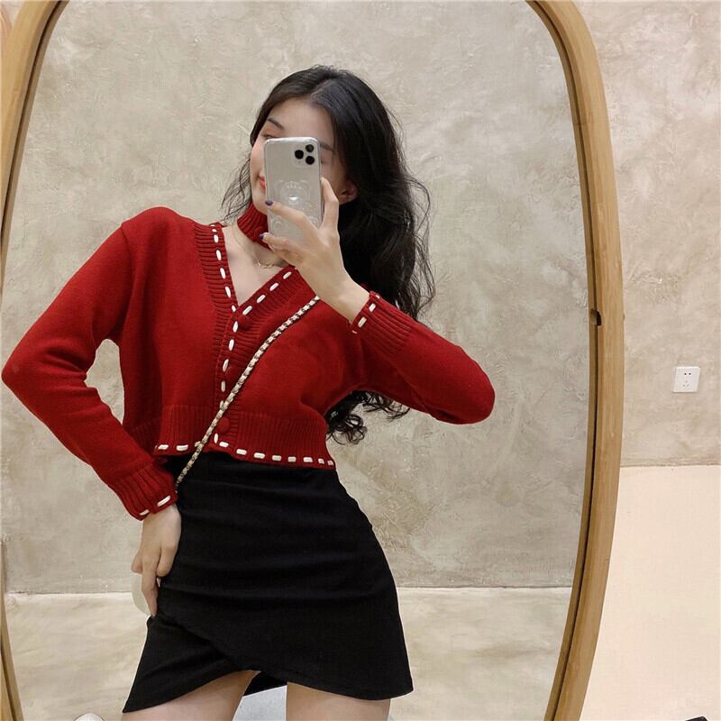 フレンチレトロコントラストカラーVネック長袖ニットセータートップレディース2020秋新作スリムセーターカーディガンジャケット ブラックストロベリース69958586213