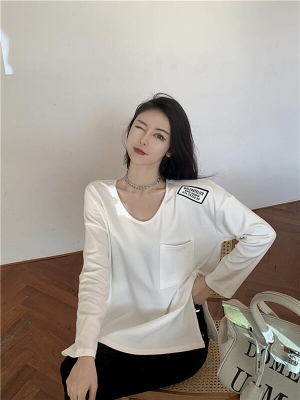 Tシャツレディースミドル丈ルーズバージョンのホワイトスプリット長袖ボトミングシャツ秋冬プラスベルベットパッド入りトップス ブラックストロベリース98659575983