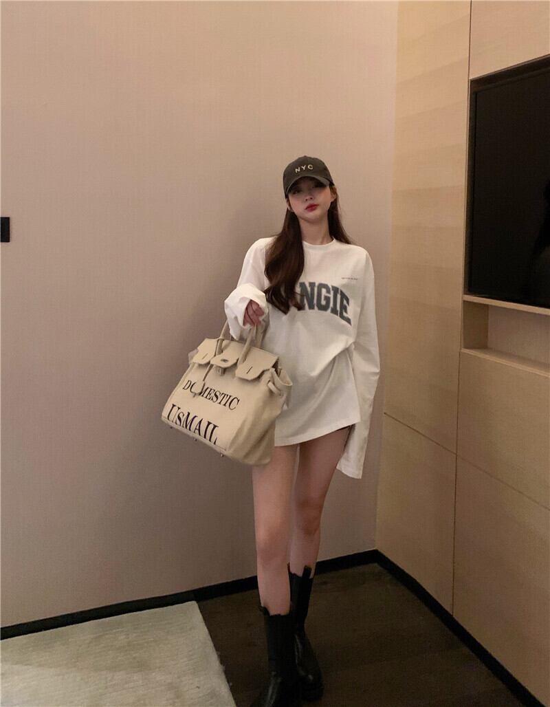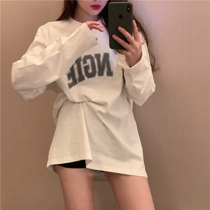 レタープリントルーズレイジーホワイト長袖Tシャツレディース2020年秋新作ミドル丈トップス ブラックストロベリース56272582386