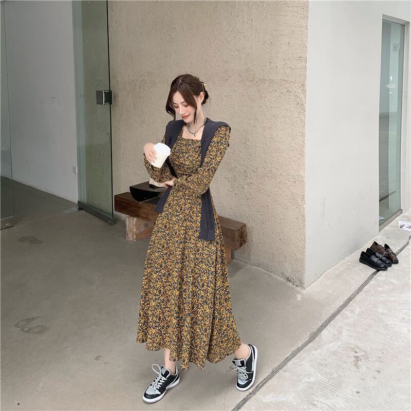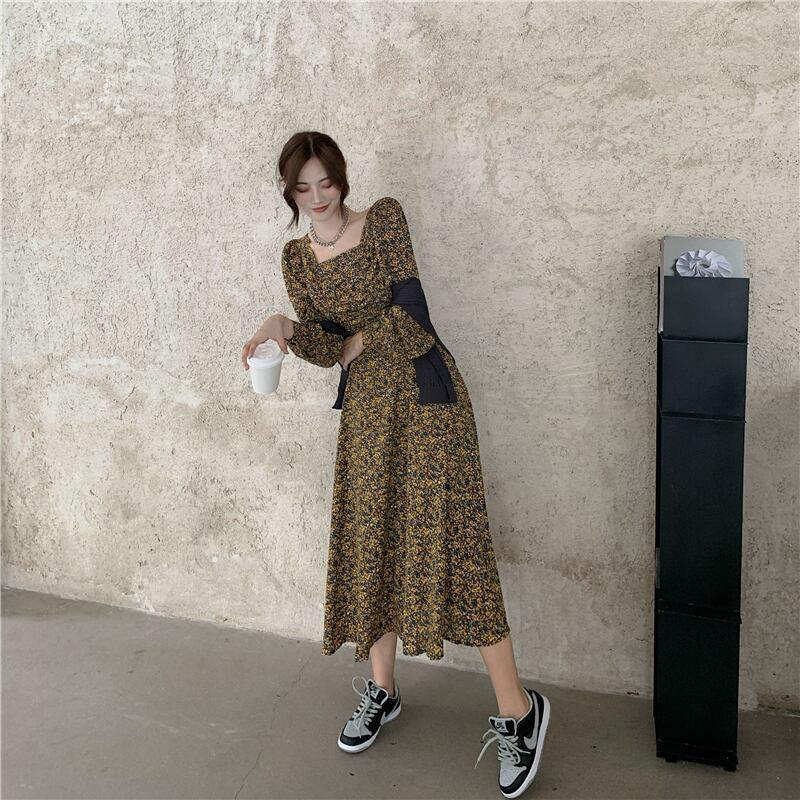 フランスのレトロなニッチな花柄のドレス女性の秋の長袖ミドル丈スカート2020新しいベルフラワー気質スカート ブラックストロベリース60025572948