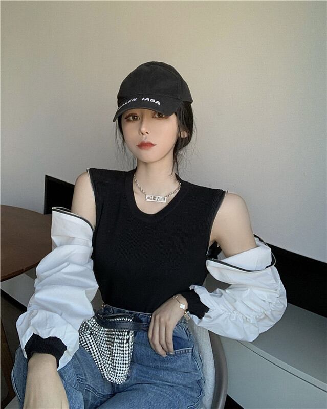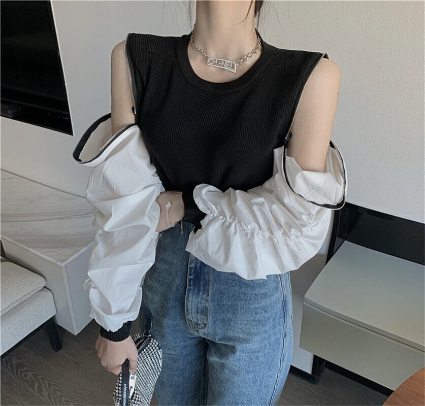 フェイクツーピースステッチジッパーオフショルダー長袖セータートップス女性2020年秋新デザインセンスアウターセーター ブラックストロベリース4231725433