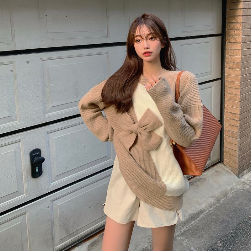 ニットセーターセータージャケット女性秋冬厚手レトロ香港スタイルボウミドル丈レイジールーズアウタージャケット ブラックストロベリース4390183395