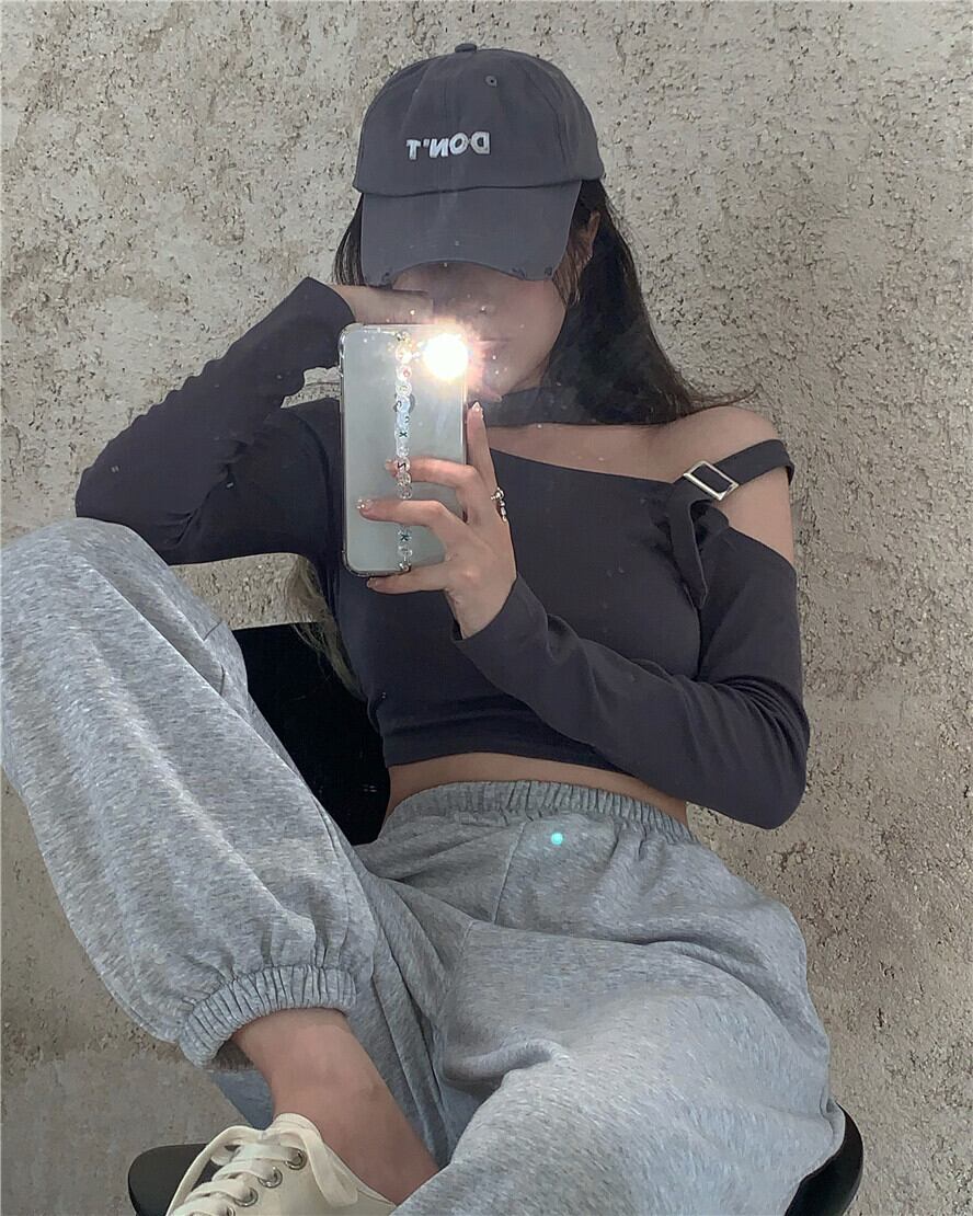 セクシーなオフショルダーハンギングネックグレーTシャツ女性秋タイト長袖ボトミングシャツ2020新しいインナーショートトップ ブラックストロベリース5281453668