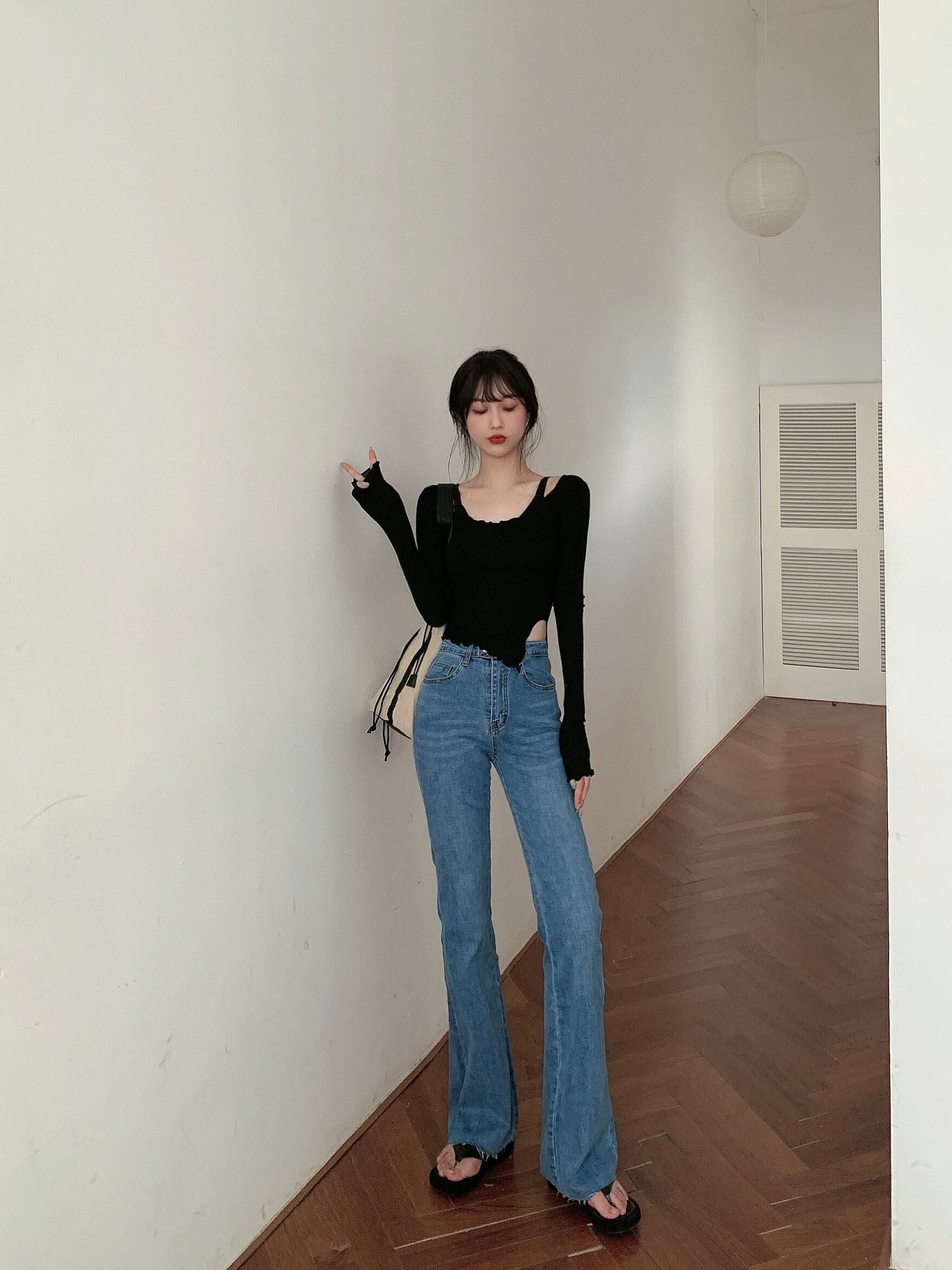 ウエストスリミングデニムフレアパンツレディース秋タイトフィットストレッチブーティーパンツ2020新作モップドレープパンツ ブラックストロベリース9869294967