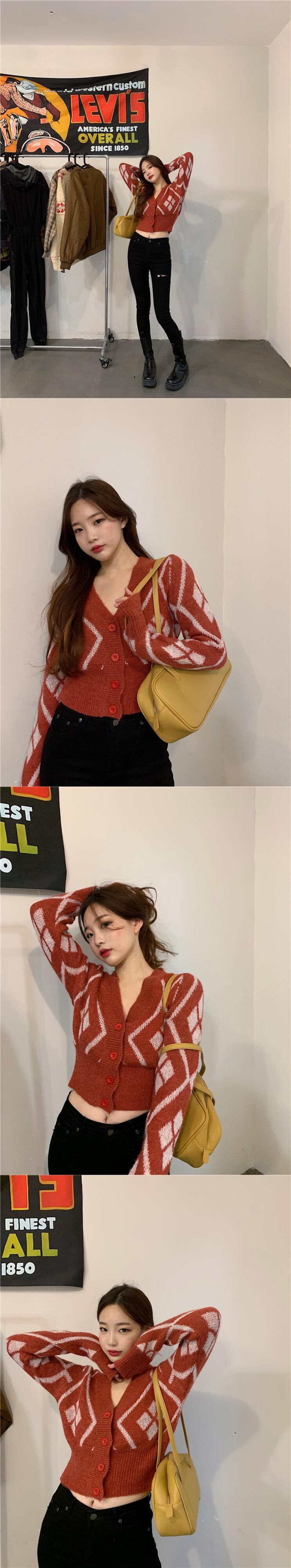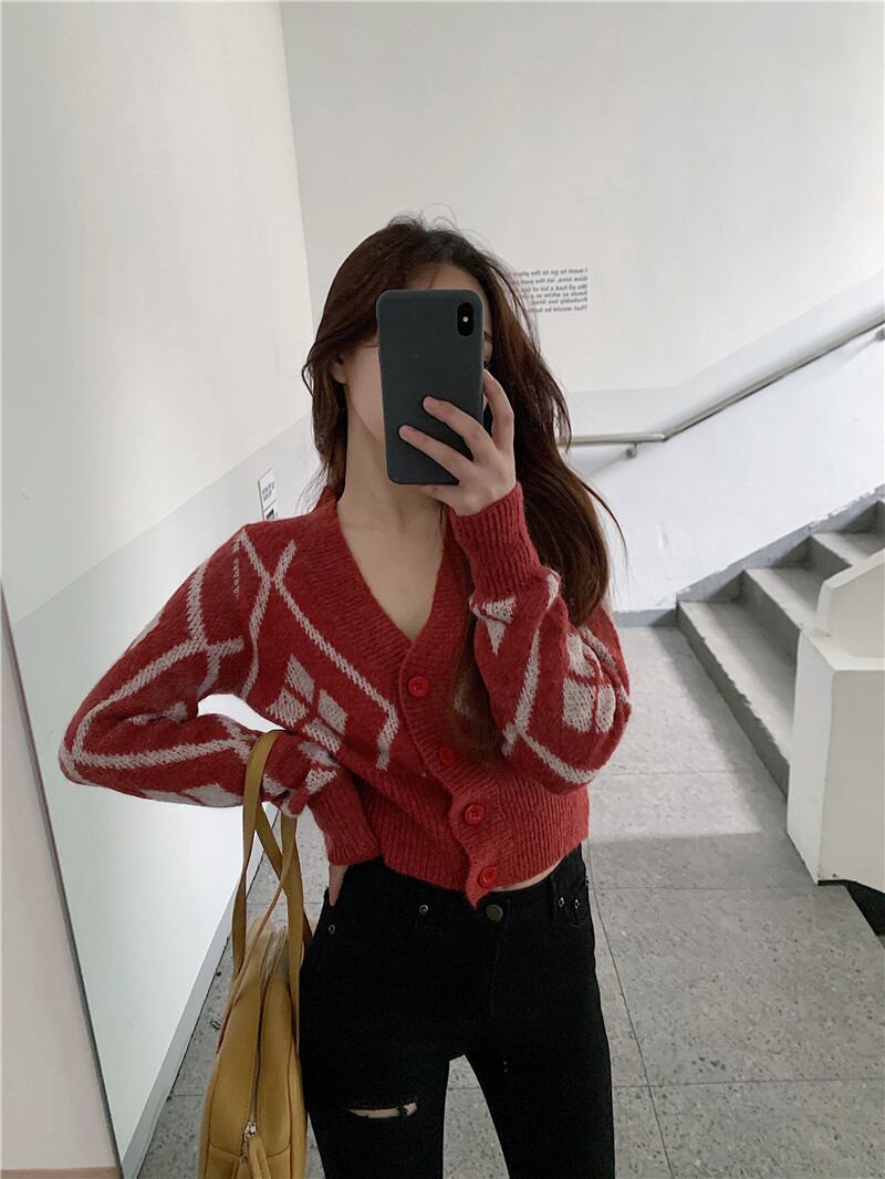 ニットセーター レディースショートスリムVネックトップス オータムウィンターレッドスタンダードスタイルカーディガンジャケット レトロ 秋物 冬物 ブラックストロベリース24608229724