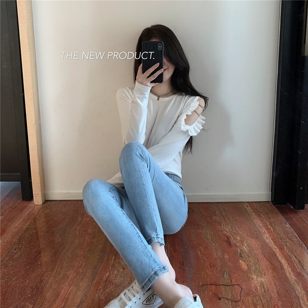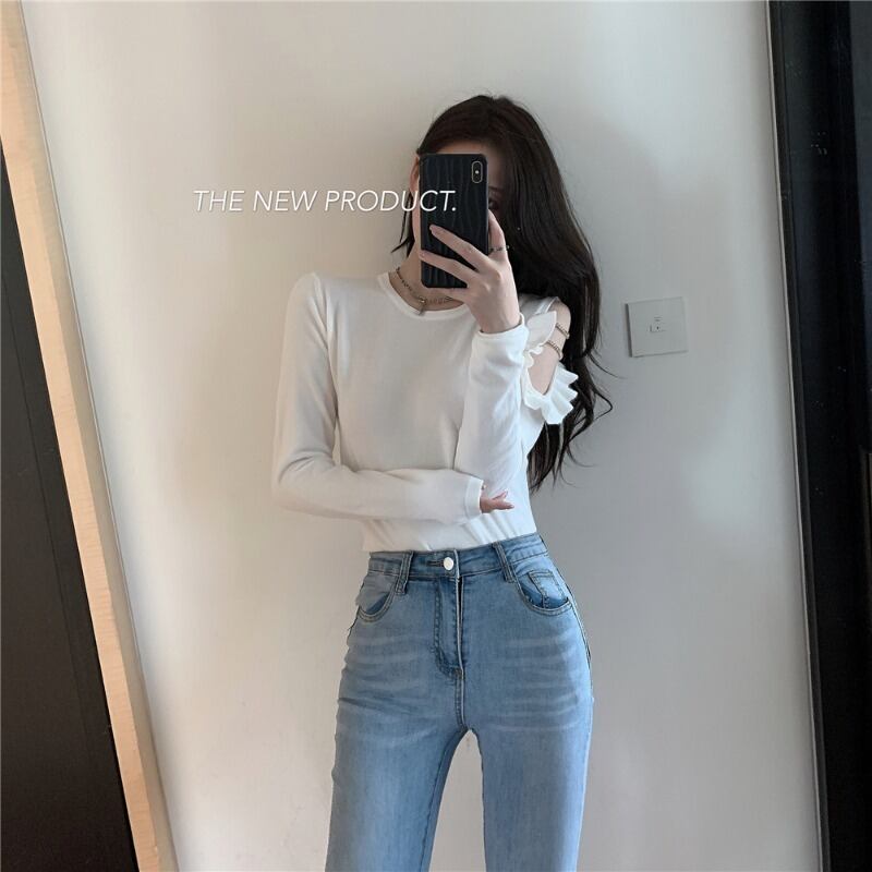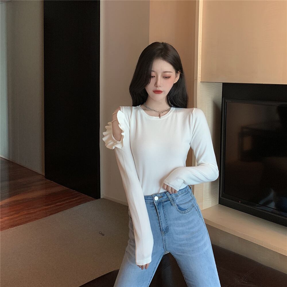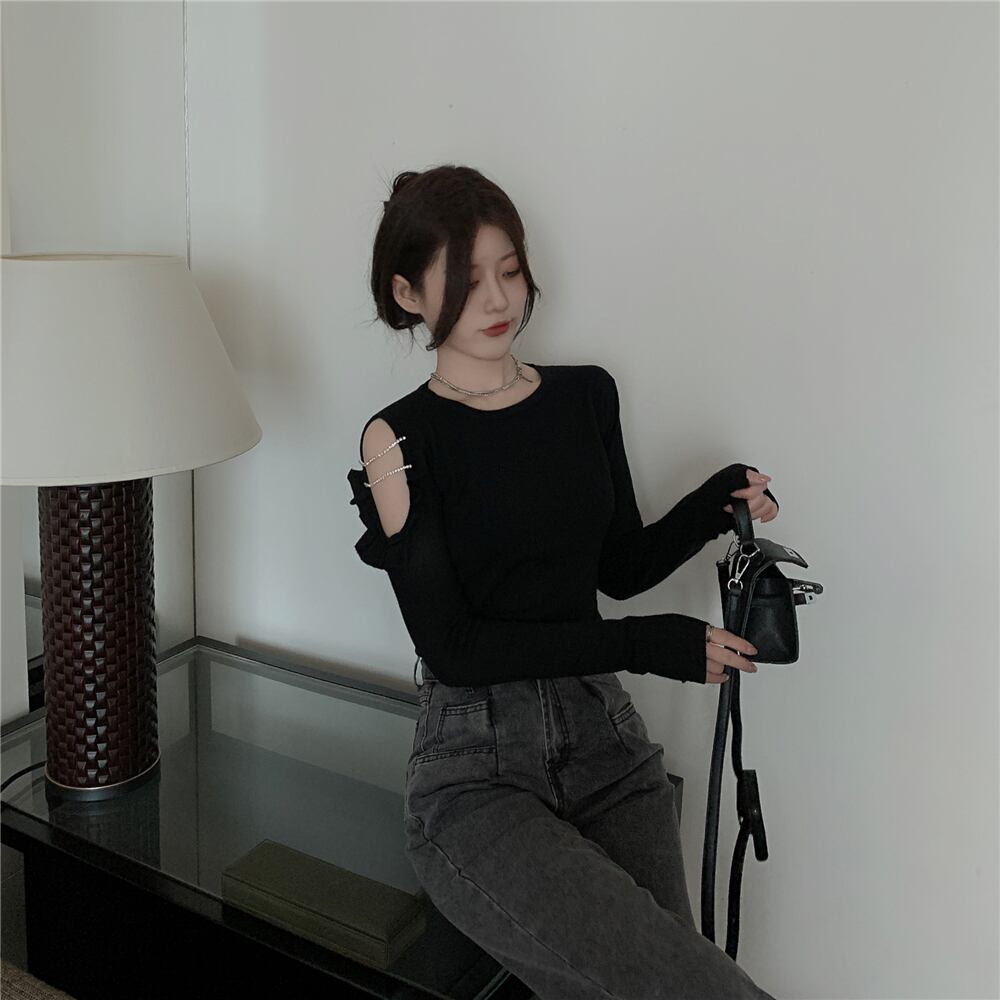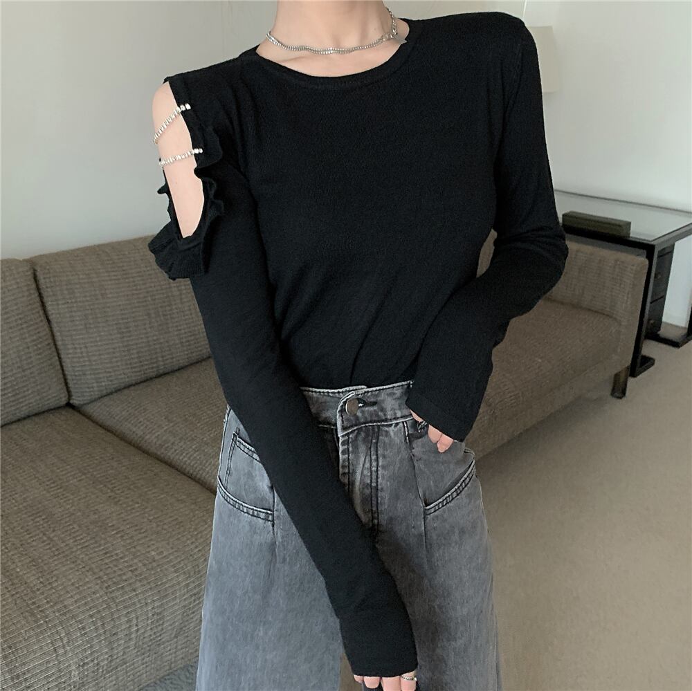 オフショルダーの黒の長袖ニットセーターボトミングシャツ女性の2020年秋新しいスリムで薄いプルオーバーインナートップ ブラックストロベリース22957024547