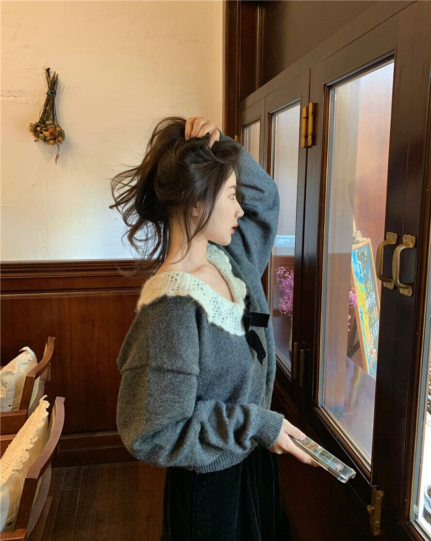 セータードールカラーボウショートルーズルーズアウターウェアセーター2020秋冬新作グレートップ ブラックストロベリース52474017528