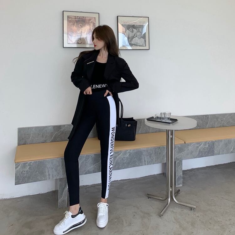 ウエストスリミングレターカラーマッチングタイトフィットストレッチレギンスレディース秋アウターウェア小足ズボン保険安全パンツ ブラックストロベリース29903593967