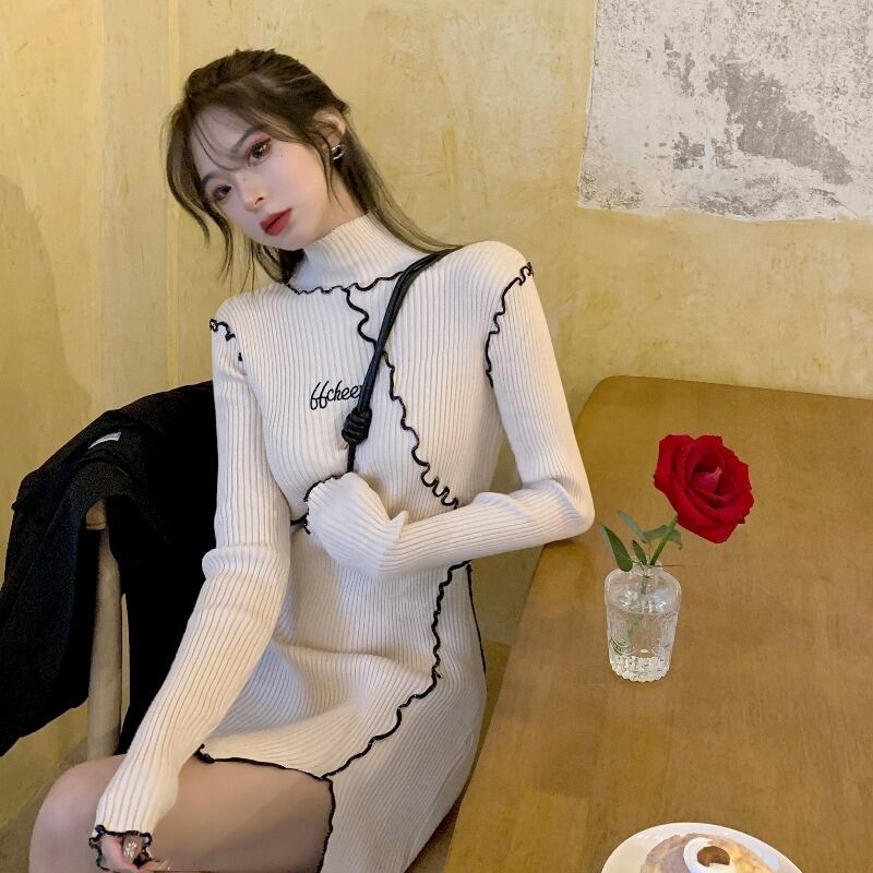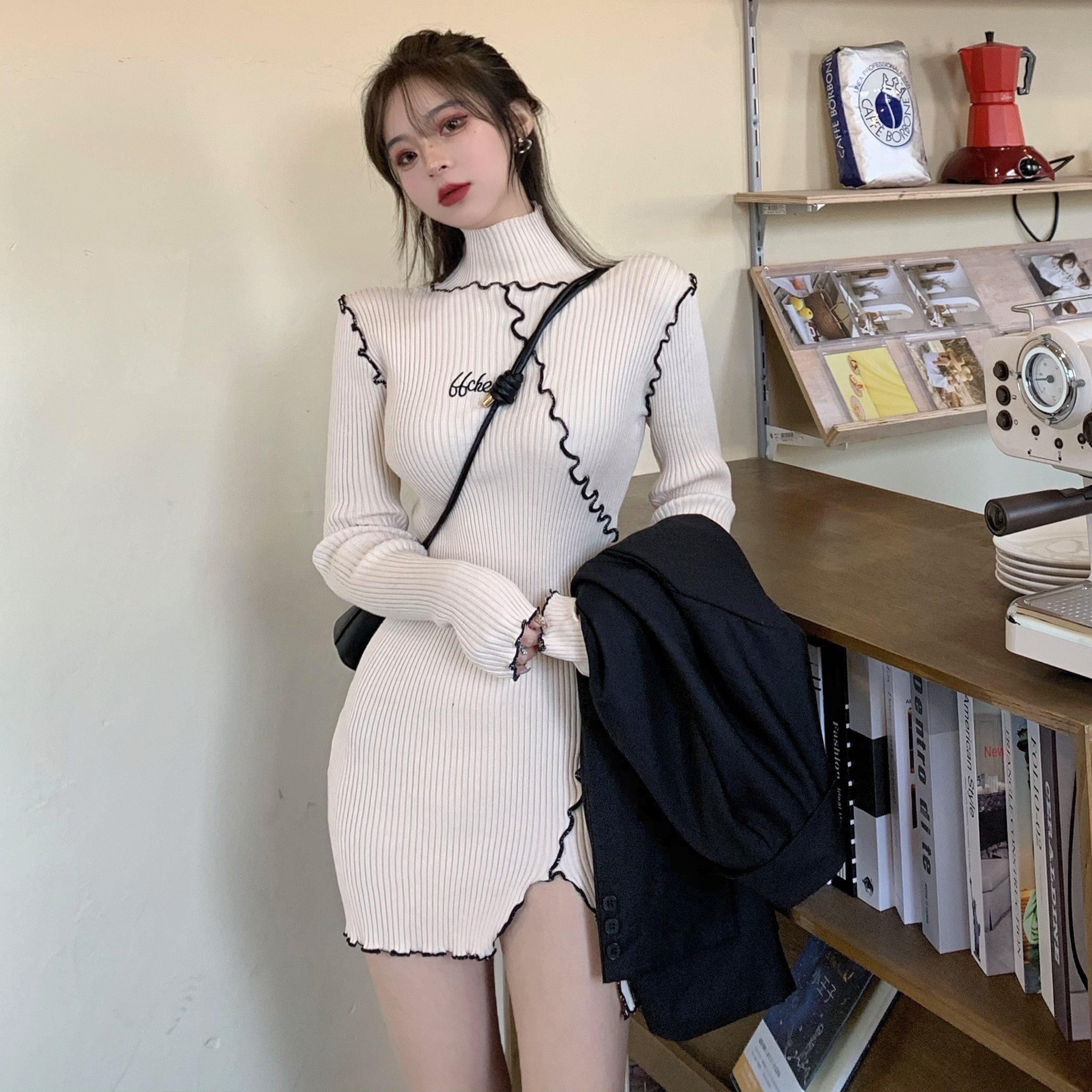 タートルネックニットセーターベーススカートドレス女性2020年秋冬新ウエストショートスカートイレギュラーロングスリーブスカート ブラックストロベリース59457966513