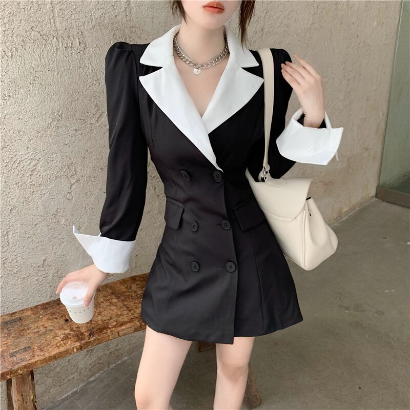 コントラストカラー長袖スーツカラードレス女性2020秋新作フレンチショートスカートウエストスリムスカート ブラックストロベリース49158647935