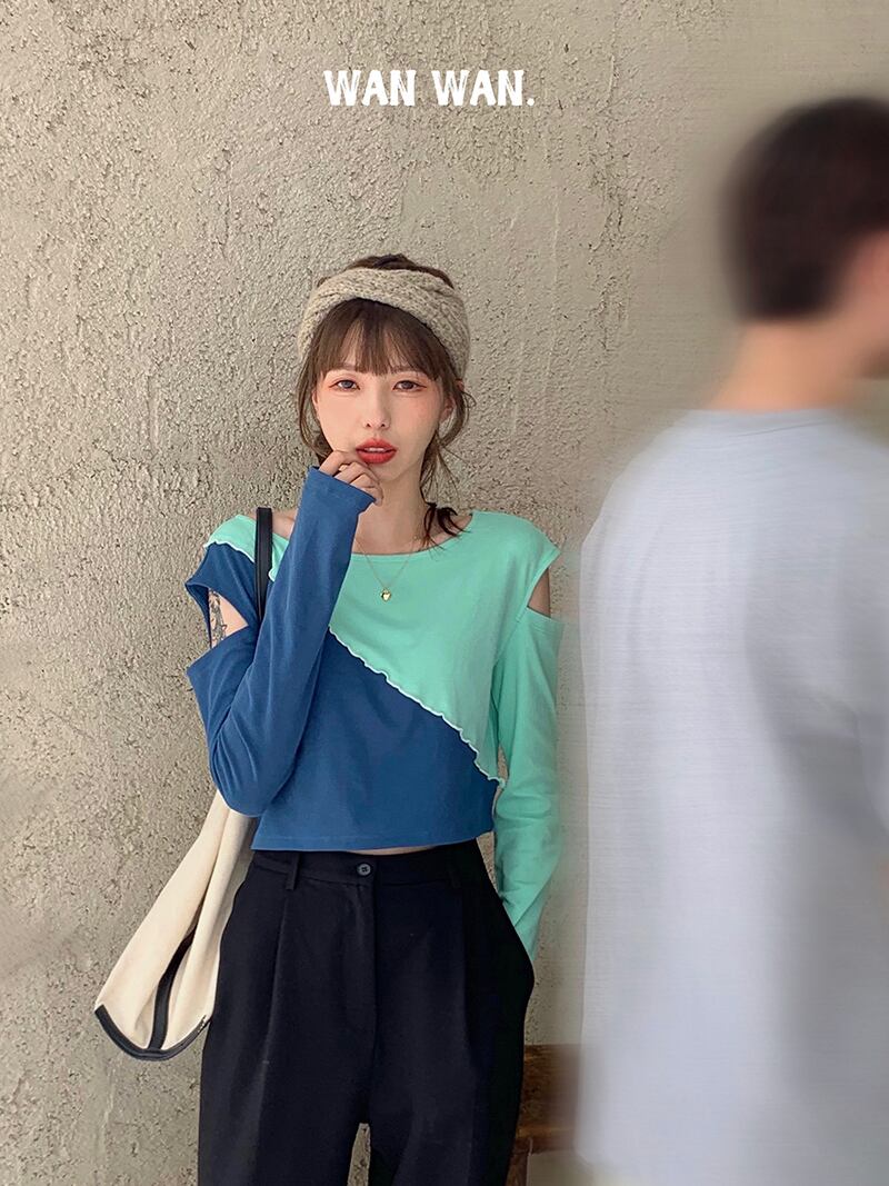 センスステッチストラップレスTシャツレディース秋ルーズ長袖ボトミングシャツ2020新しいショートインナートップ ブラックストロベリース23122519507