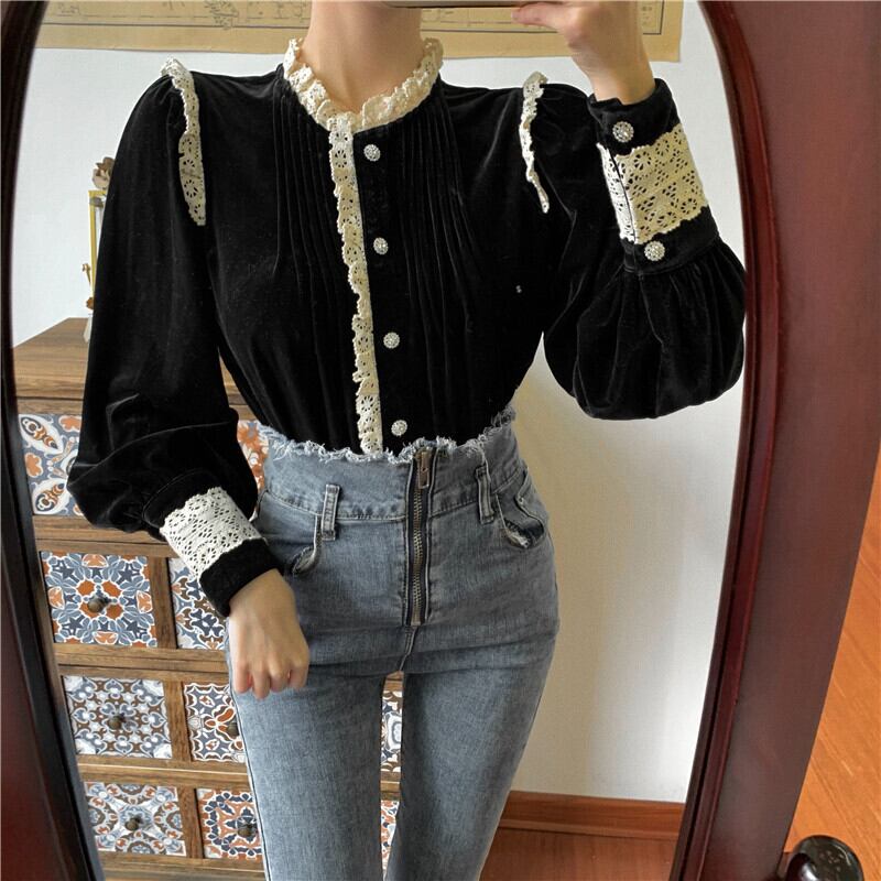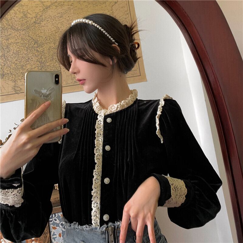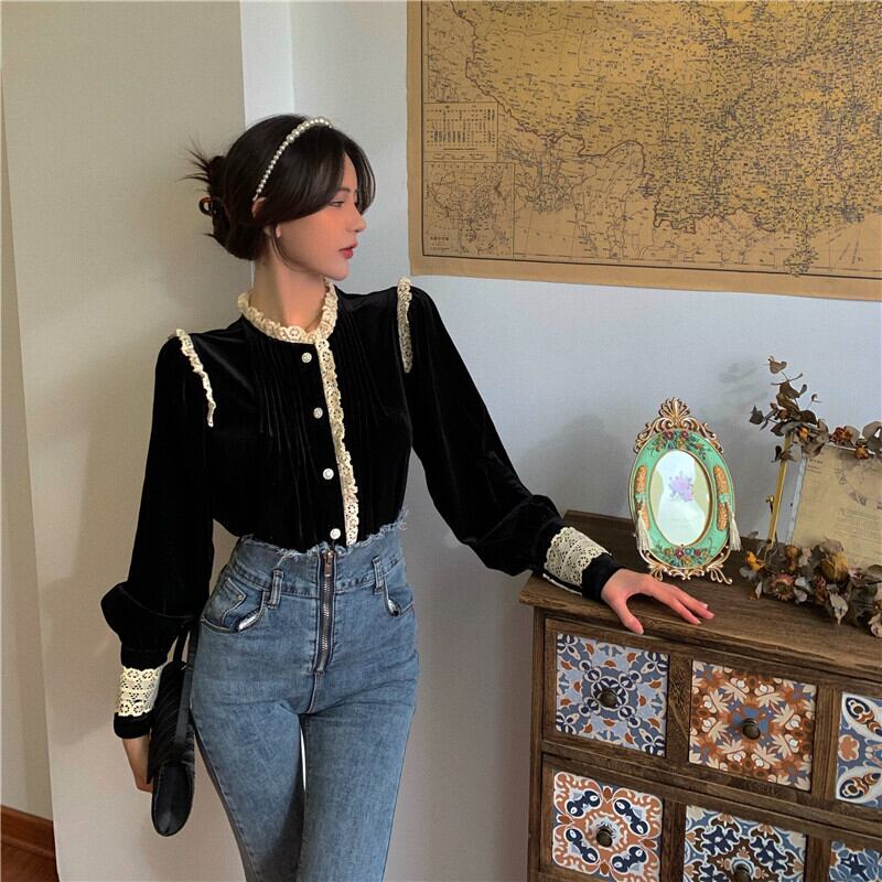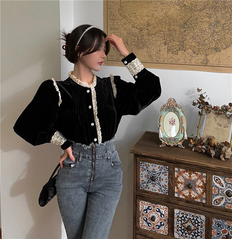 シャツ スタンダードブラックレースベルベットトップス オータムウィンター ロング レトロ 秋物 冬物 ステッチ ブラックストロベリース30954649698