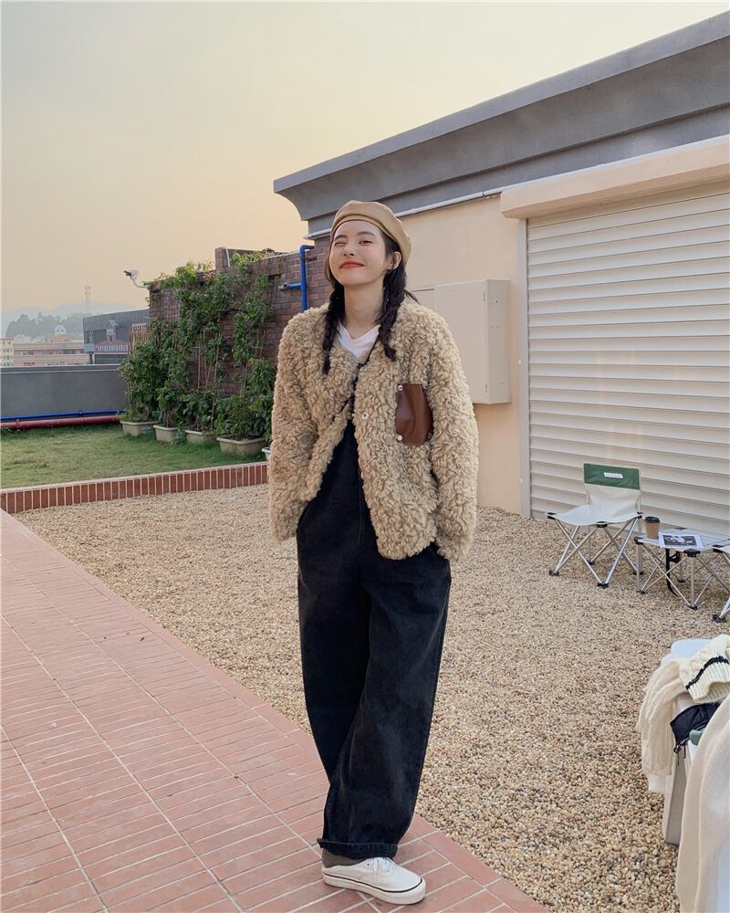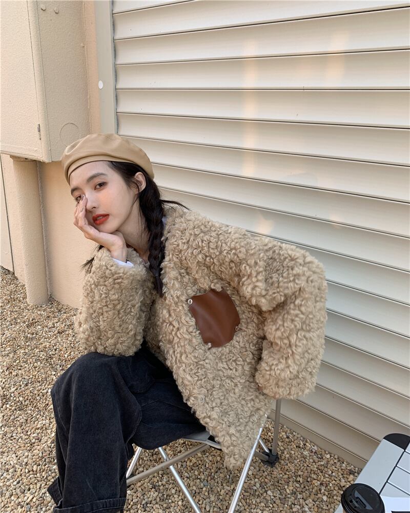 ラムウールショートコートレディーススモールシックルーズバージョンのワイルドカジュアルエインスタイルジャケット2020秋冬新作 ブラックストロベリース35347132548