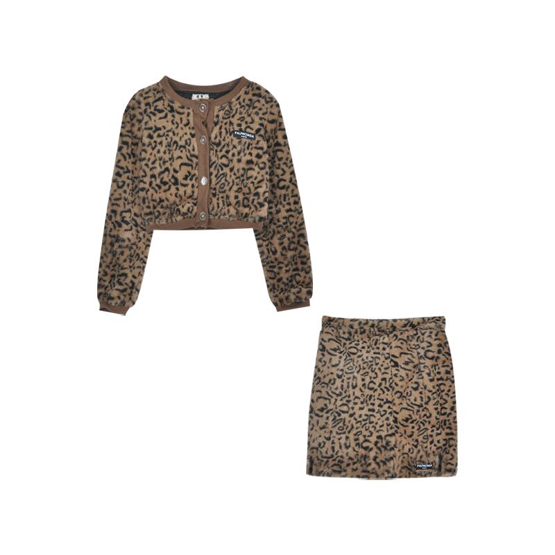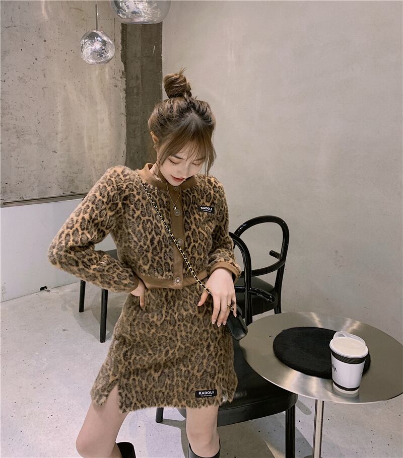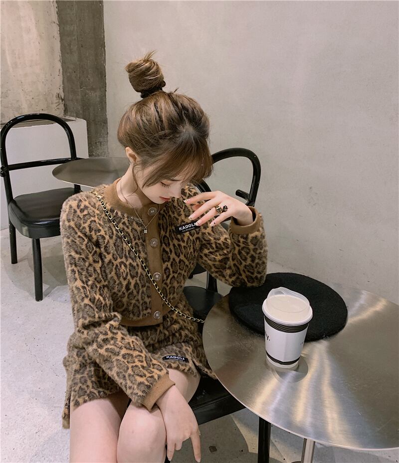 レオパードプリント柄ニットセーター カーディガンジャケット レディーススタイルスタンダードルーズショート長袖スリーブトップス ロング レトロ ウィンター 冬物 ブラックストロベリース78027050246