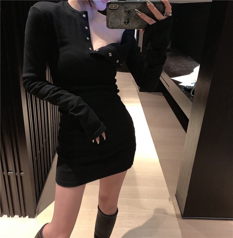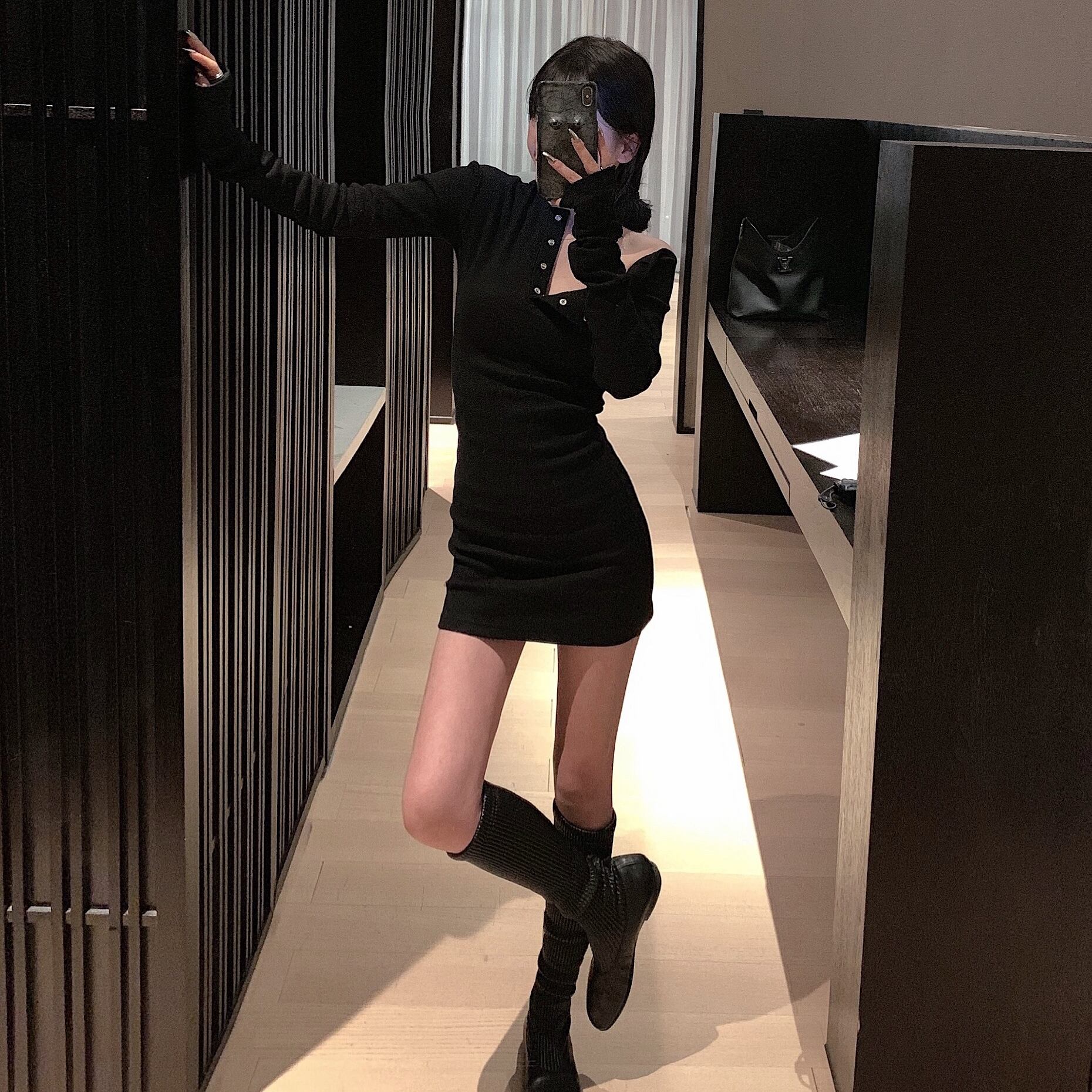 ブラックドレス ショートスカート オータムウィンターウェストスリム ロング 秋物 冬物 ブラックストロベリース73108917737