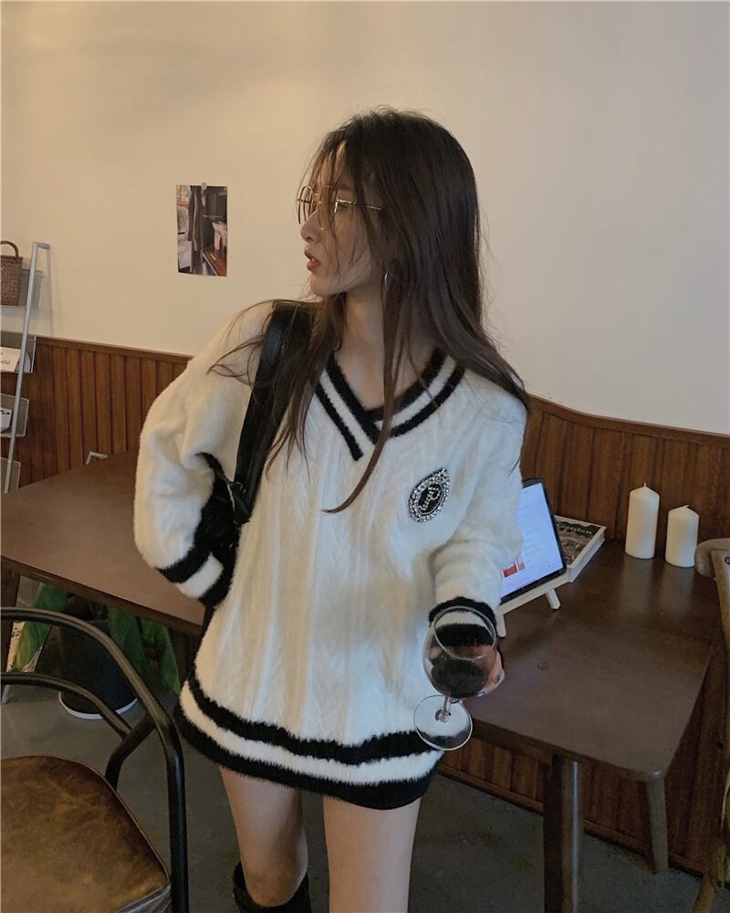 セーター ルーズスタイルブラックVネックオータムウィンタージャケット トップス 秋物 冬物 ブラックストロベリース83476455112