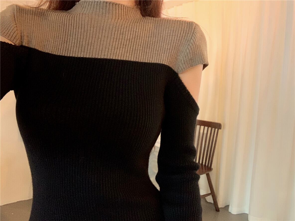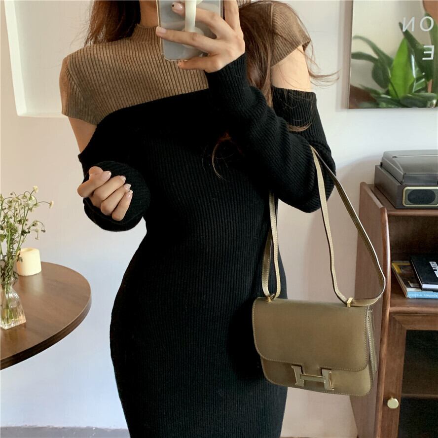 ニットセーター ドレス オータムウィンタースカート ウェストスリム長袖スリーブ ロング 秋物 冬物 ブラックストロベリース93250554053