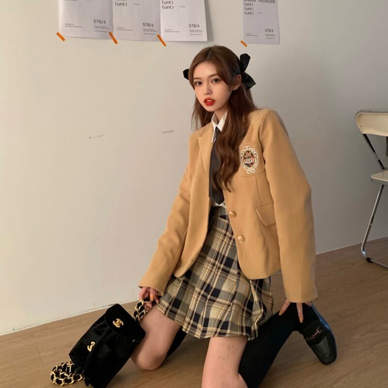 色:ダークブルーコート,カーキ色のコート,プリーツスカート,シャツと蝶ネクタイ