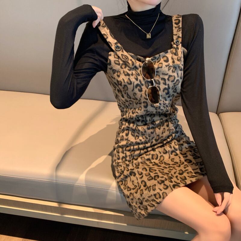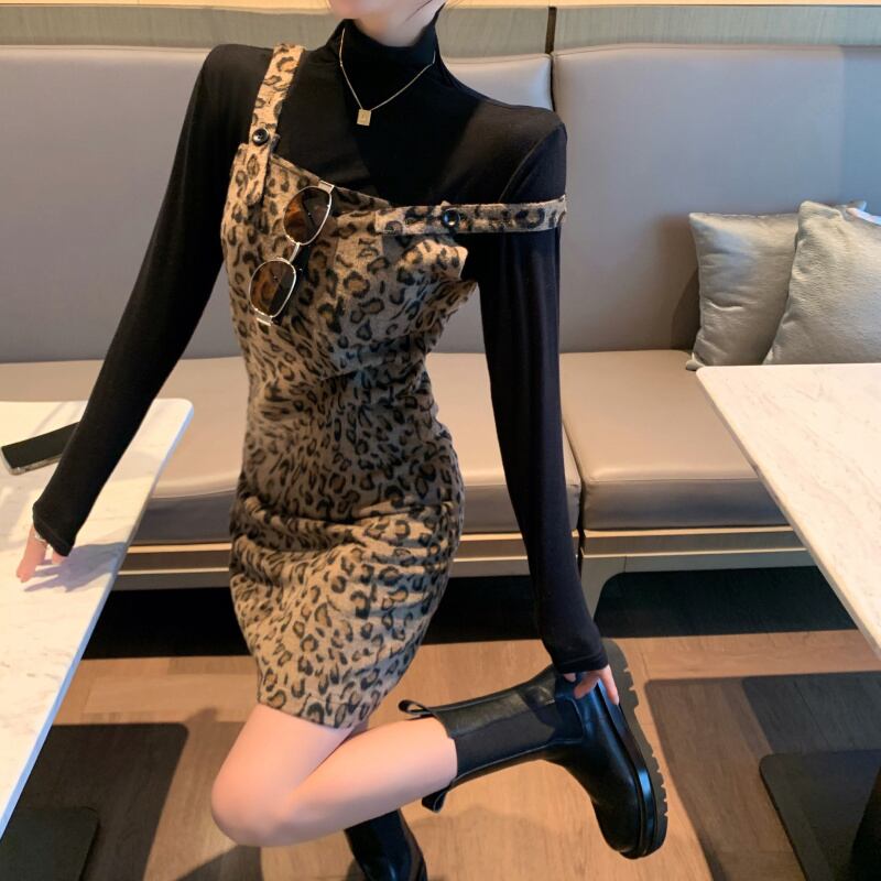 ドレス レオパードプリント柄ウェストスリムスカート オータムウィンターショート 秋物 冬物 ブラックストロベリース94198845916