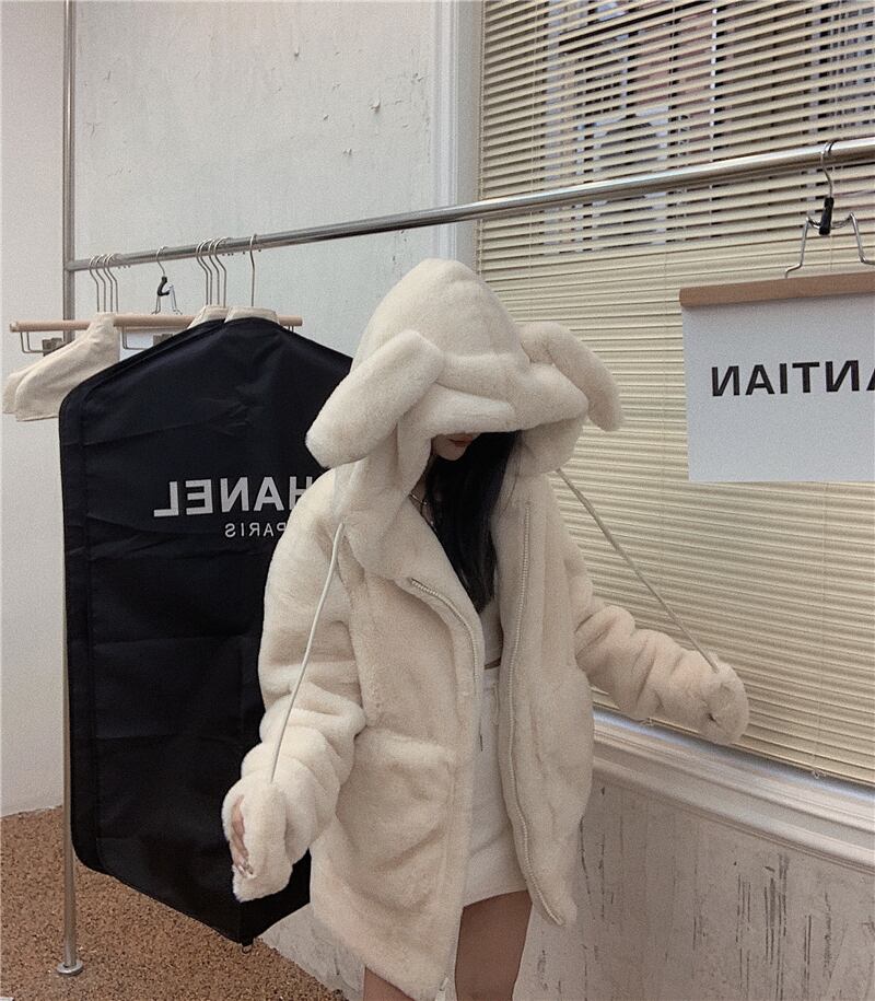 フェイクファーショートコート オータムウィンターベルベットフードトップス 秋物 冬物 ブラックストロベリース73267664987