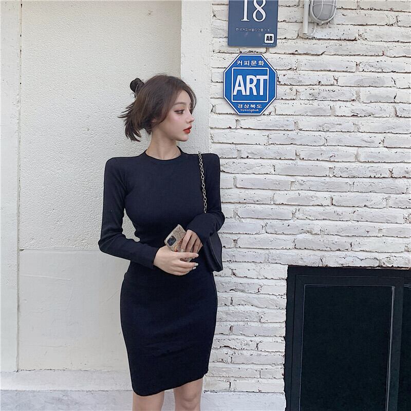 スリム長袖スリーブドレス ショートスカート オータムウィンターグレー薄手ニット ロング 秋物 冬物 ブラックストロベリース21540512326