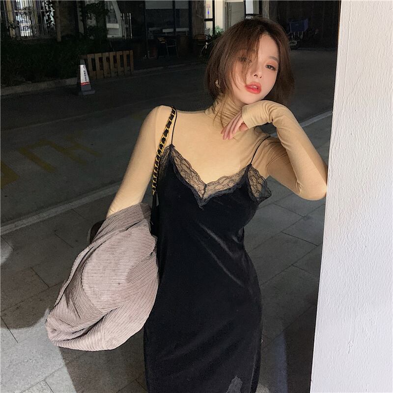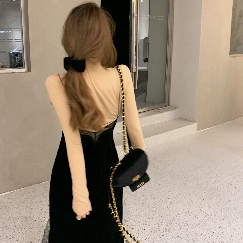 レースベルベットドレス レディースオータムウィンタースカート ブラックスリット 秋物 冬物 ブラックストロベリース22716453650