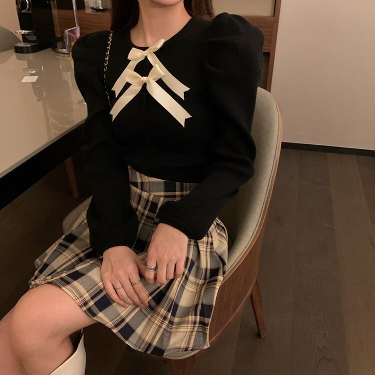 セーター スリムブラックニットトップス リボン ブラックストロベリース35224502749