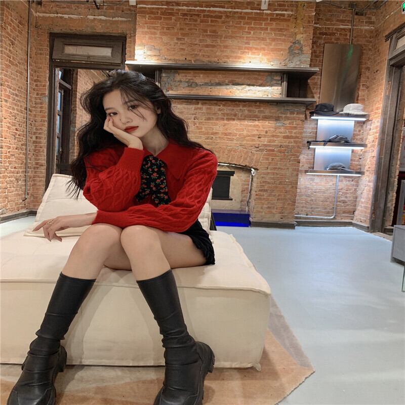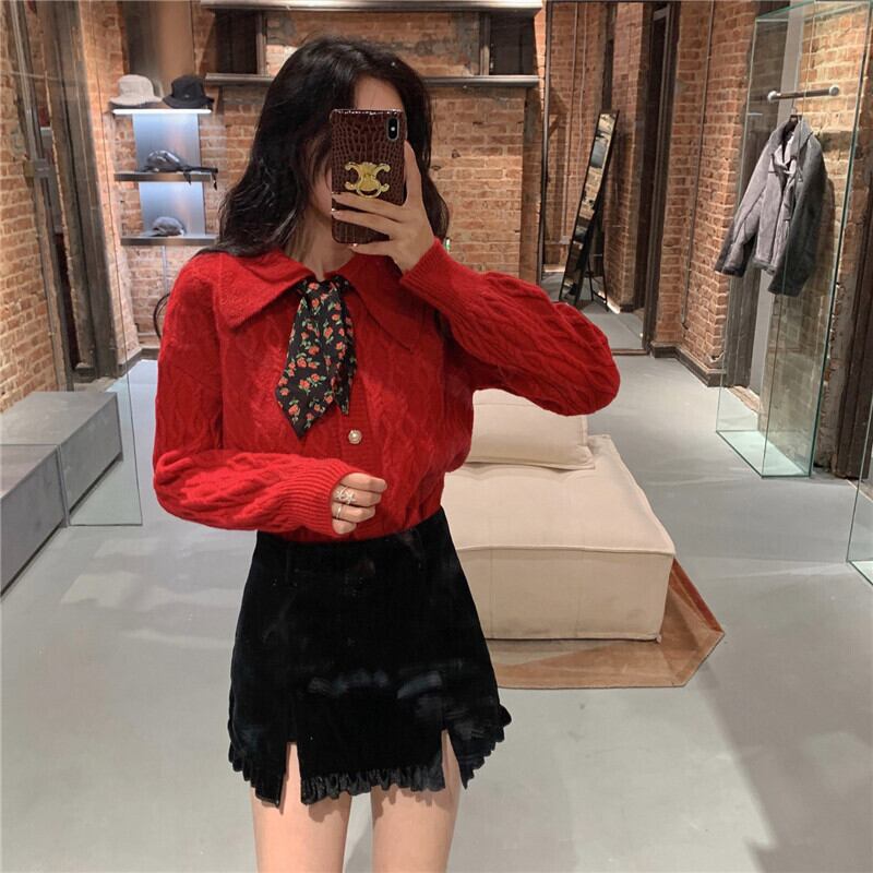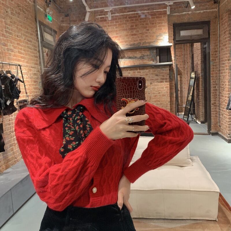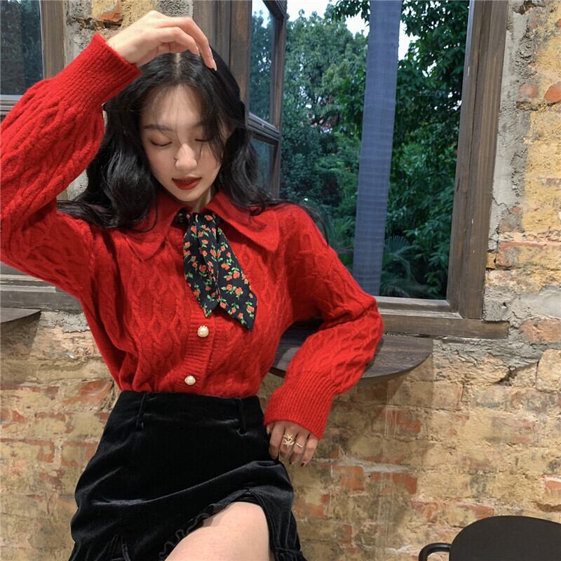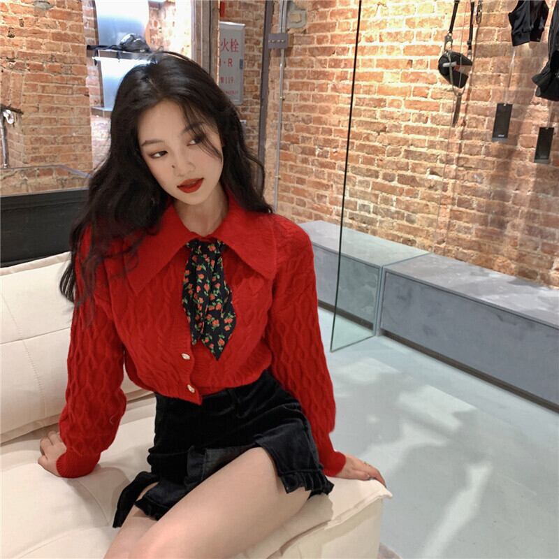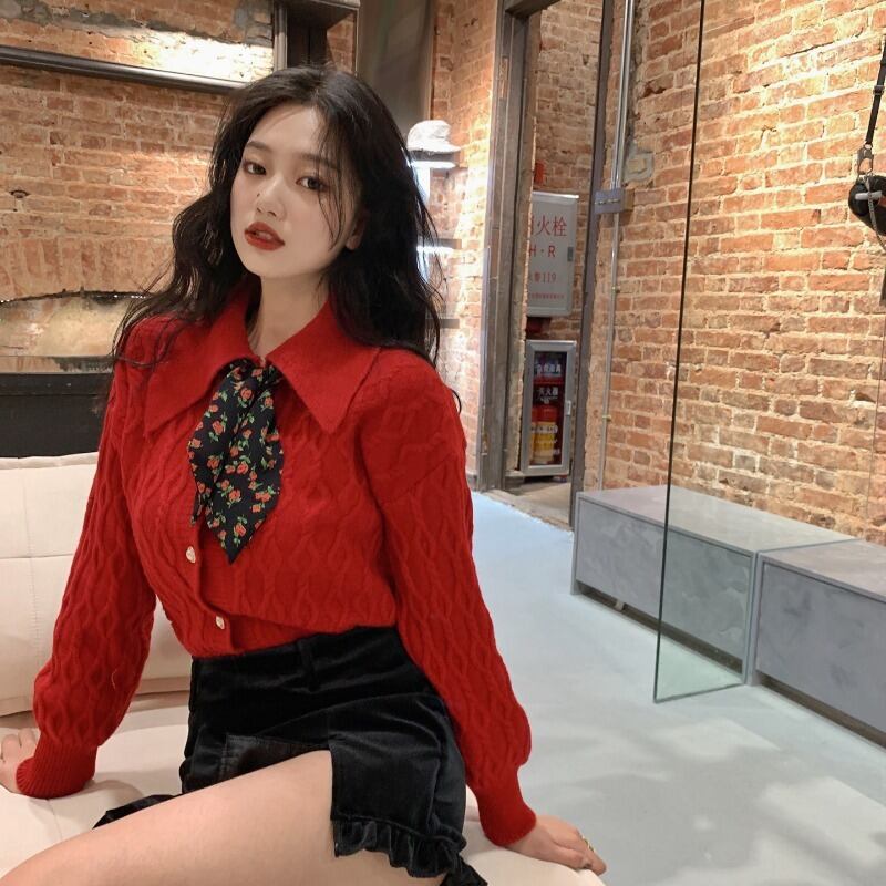セーター カラールーズレッドニットコート カーディガン ウィンター 冬物 ブラックストロベリース3246698195