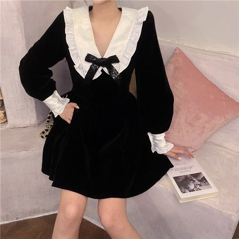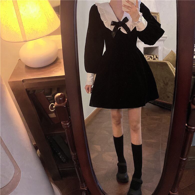 カラードレス オータムウィンターリボンスリーブ長袖スカート ウェストAライン ロング 秋物 冬物 ブラックストロベリース22824644643